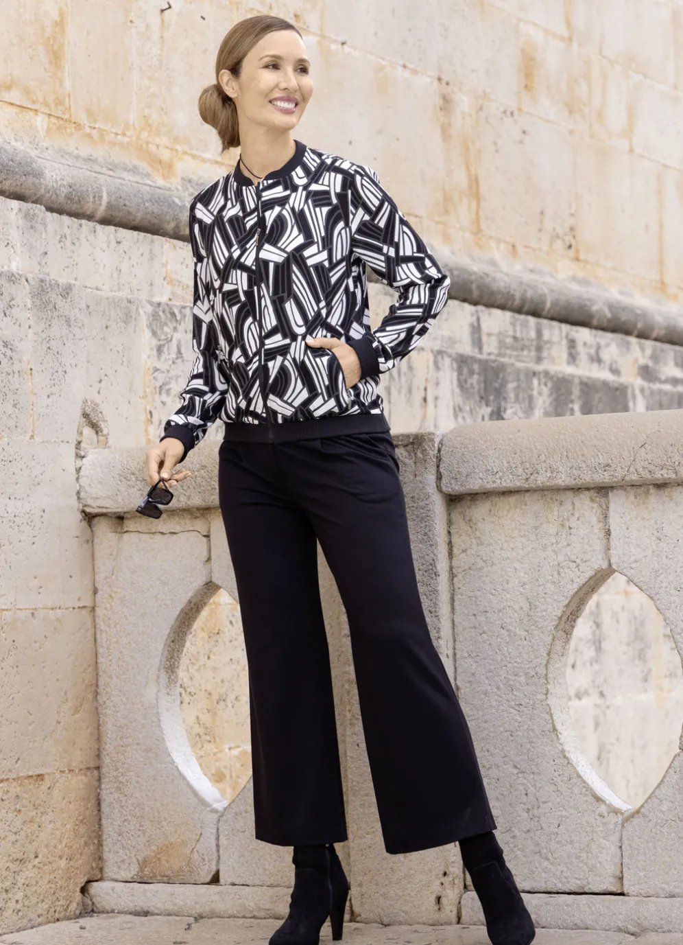 Schicke Blusenjacke mit farbbrillantem Druck in Schwarz-Weiß-Grau, schwarzem Stehkragen, Reißverschlussleiste, langen Ärmeln mit schwarzen Rippenbündchen, zwei seitlichen Reißverschlusstaschen sowie schwarzen Rippenbündchen am Saum rundum.