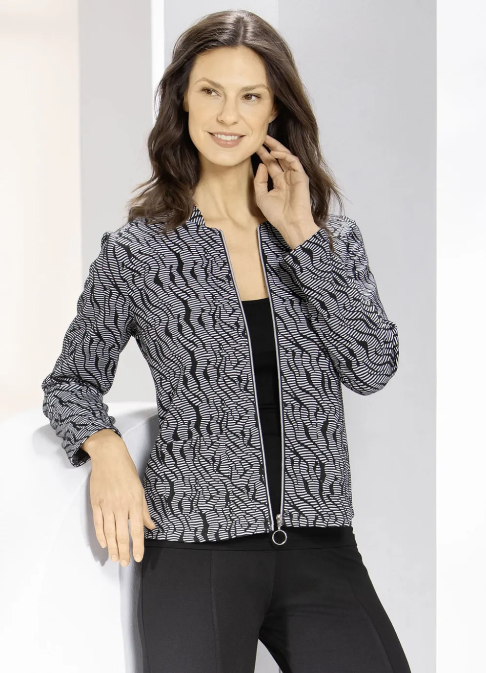 Flotte Blusenjacke in Schwarz-Weiß, mit Stehkragen, Reißverschlussleiste, zwei Eingriffstaschen, langen Ärmeln sowie Vorderpasse.