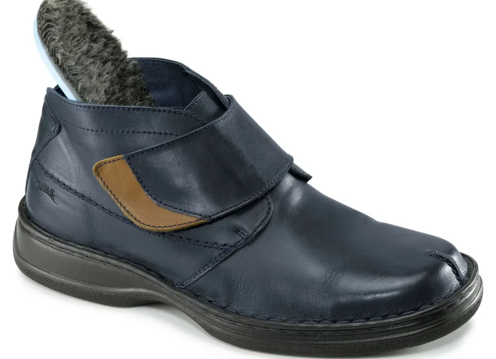 Boot mit verstellbarer Klettspange in Marine-Braun und in Größe 45.