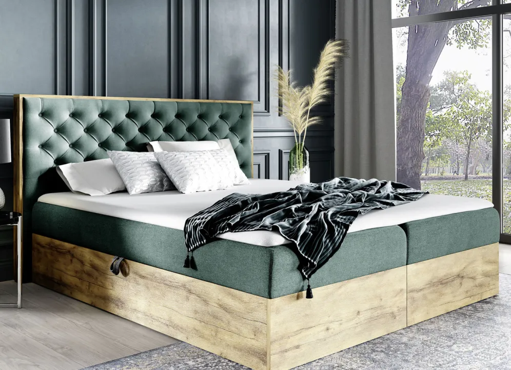 Komfortables Boxspringbett mit eleganter Knopfsteppung am Kopfteil. Der hochwertige Rahmen aus Wotan Eiche verleiht dem Bett eine stilvolle Optik. Mit geräumigem Bettkasten (bei 90×200 cm Bettkasten von vorne zu öffnen, ab 140×200 cm Bettkästen seitlich zu öffnen).