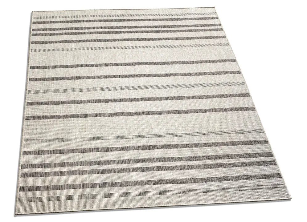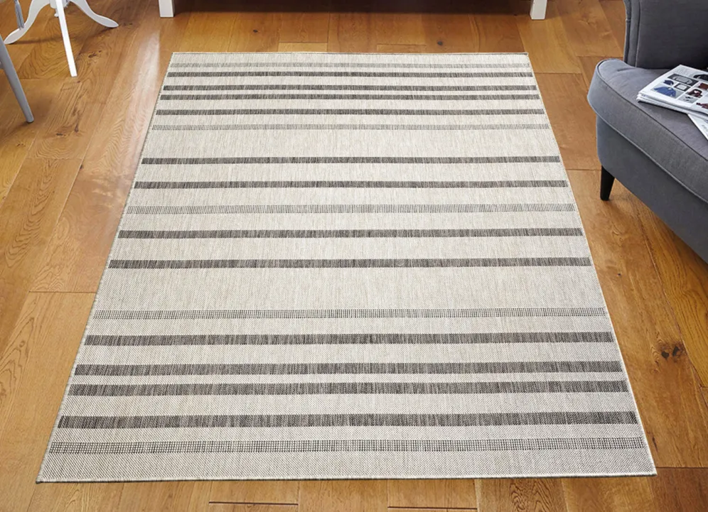 Schaffen sowohl in Ihrem Wohnraum als auch im Freien ein tolles Ambiente – diese kombistarken, beigefarbenen Brücken und Teppiche mit Streifendessin. Gesamthöhe: 5 mm. Qualität: Flachgewebe aus 100% Polypropylen