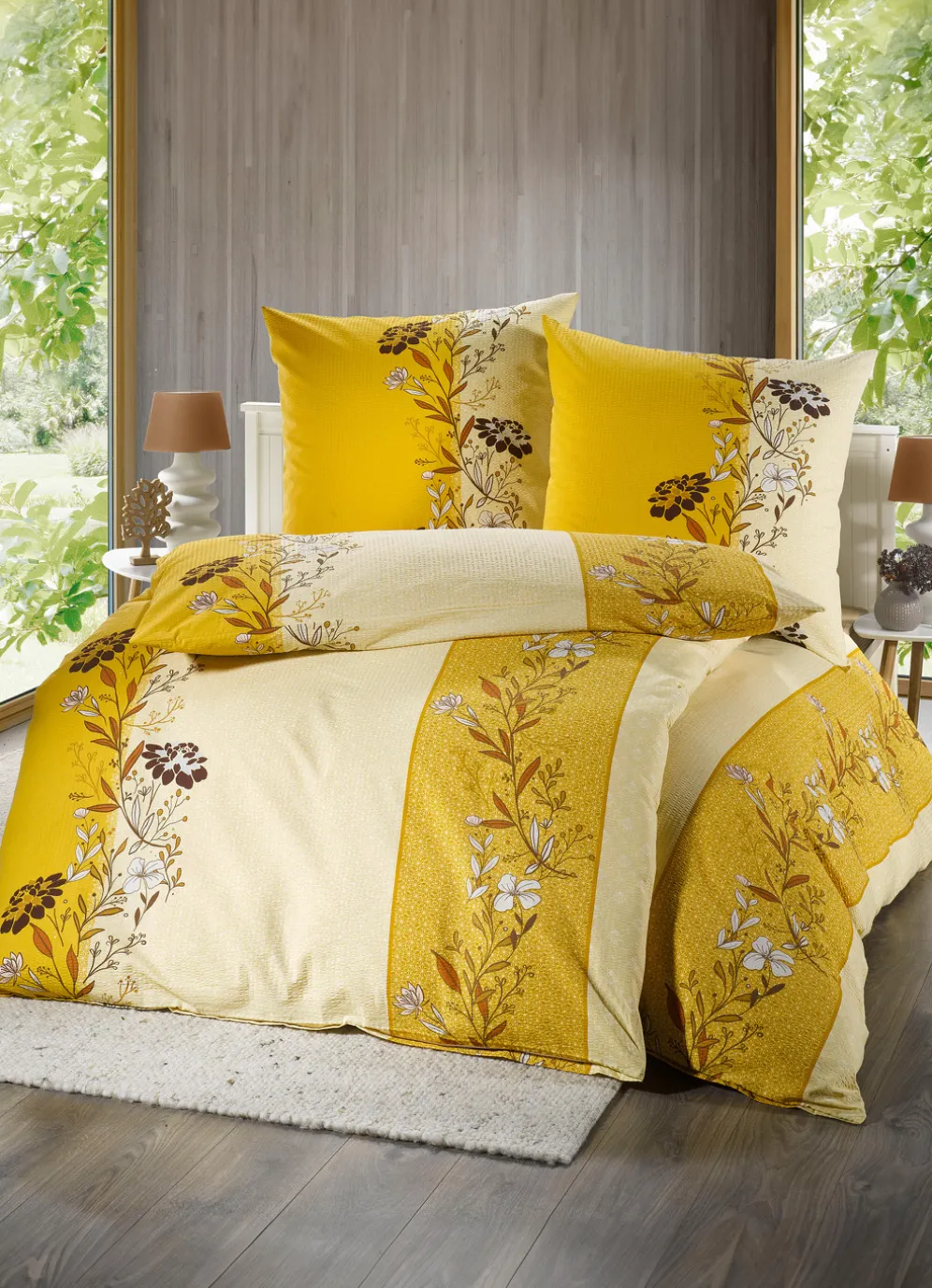 Bügelfreie Seersucker Bettwäsche-Garnitur in Größe 111 (40/80 cm + 135/200 cm) und in Gelb.