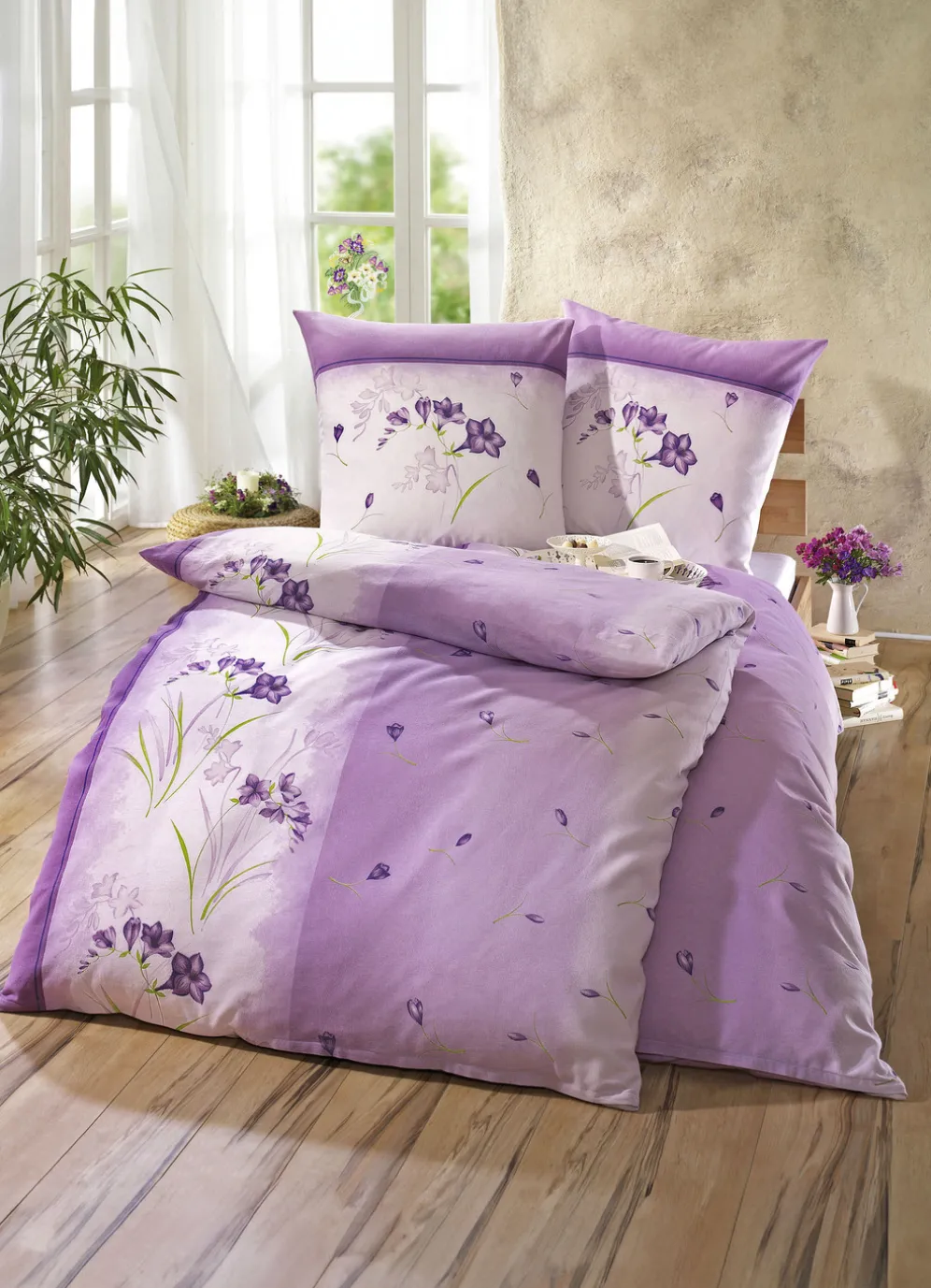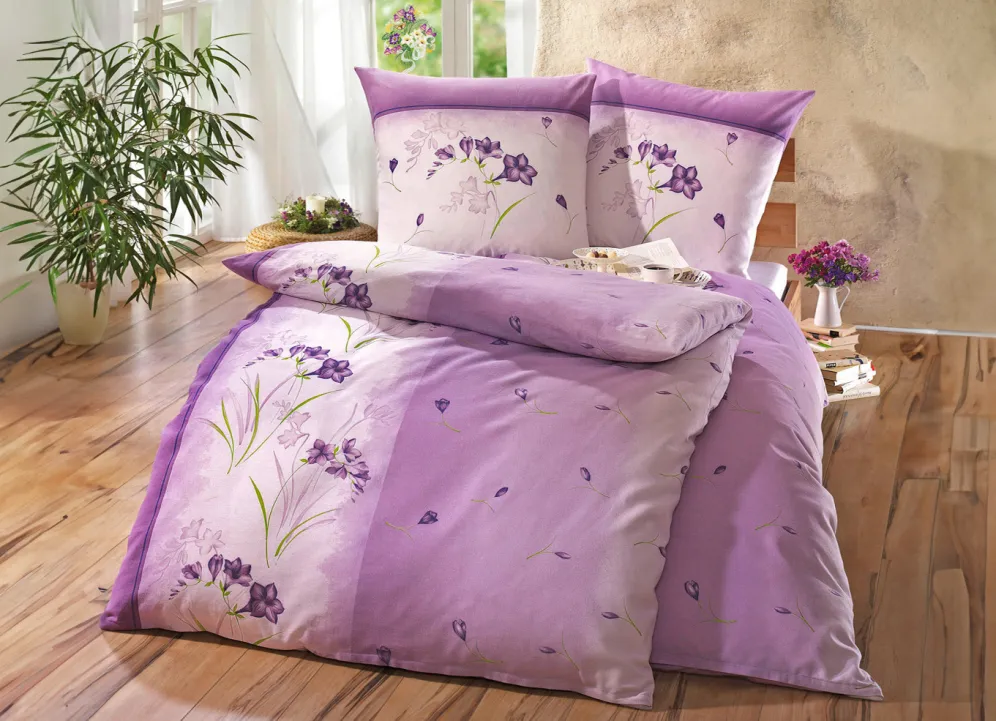 Bügelleichte DOBNIG Bettwäsche-Garnitur mit Reißverschluss in Größe 111 (40/80 cm + 135/200 cm), in Qualität Biber sowie in Flieder.