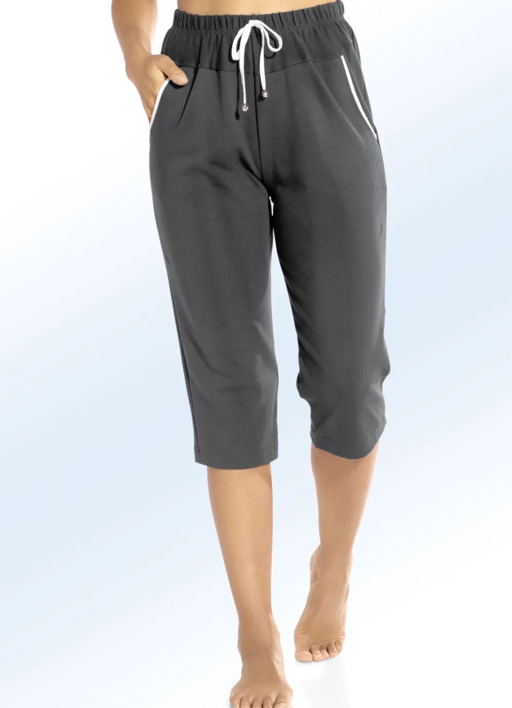 Komfortable Caprihose mit bequemem Dehnbund rundum und kontrastfarbenem Zierband sowie weißer Paspelierung an den beiden Schubtaschen.