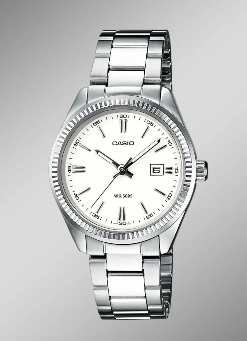 Entdecken Sie Eleganz und Präzision vereint in der neuen Casio Damenuhr. Mit einem Gehäusedurchmesser von 30 mm und einem robusten Edelstahlbandgehäuse ist diese Uhr ein zeitloses Accessoire für jede Gelegenheit. Das Mineralglas schützt das Zifferblatt, während die 5 bar Wasserdichtigkeit Ihnen die Freiheit gibt, ohne Sorge um Ihre Uhr zu leben. Die Quarztechnologie garantiert Genauigkeit, und die praktische Faltschließe sorgt für Komfort am Handgelenk. Nicht zu vergessen, das elegante Design und die nützliche Datumsanzeige machen diese Uhr zu einem Must-Have für jede modebewusste Frau.