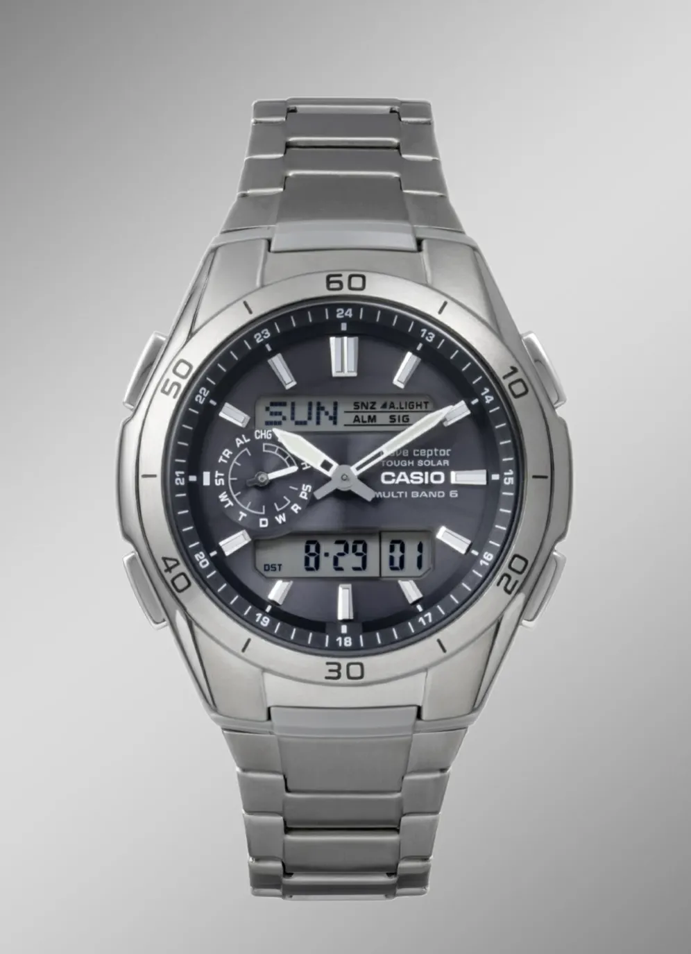 Casio Wave Ceptor Herrenuhr mit Gehäuse aus Edelstahl und mit einem Uhrenband aus Edelstahl.