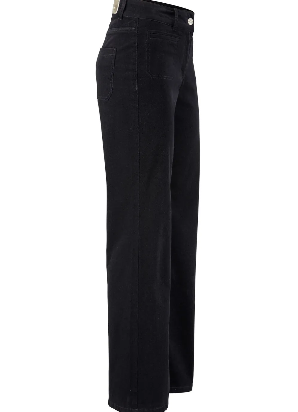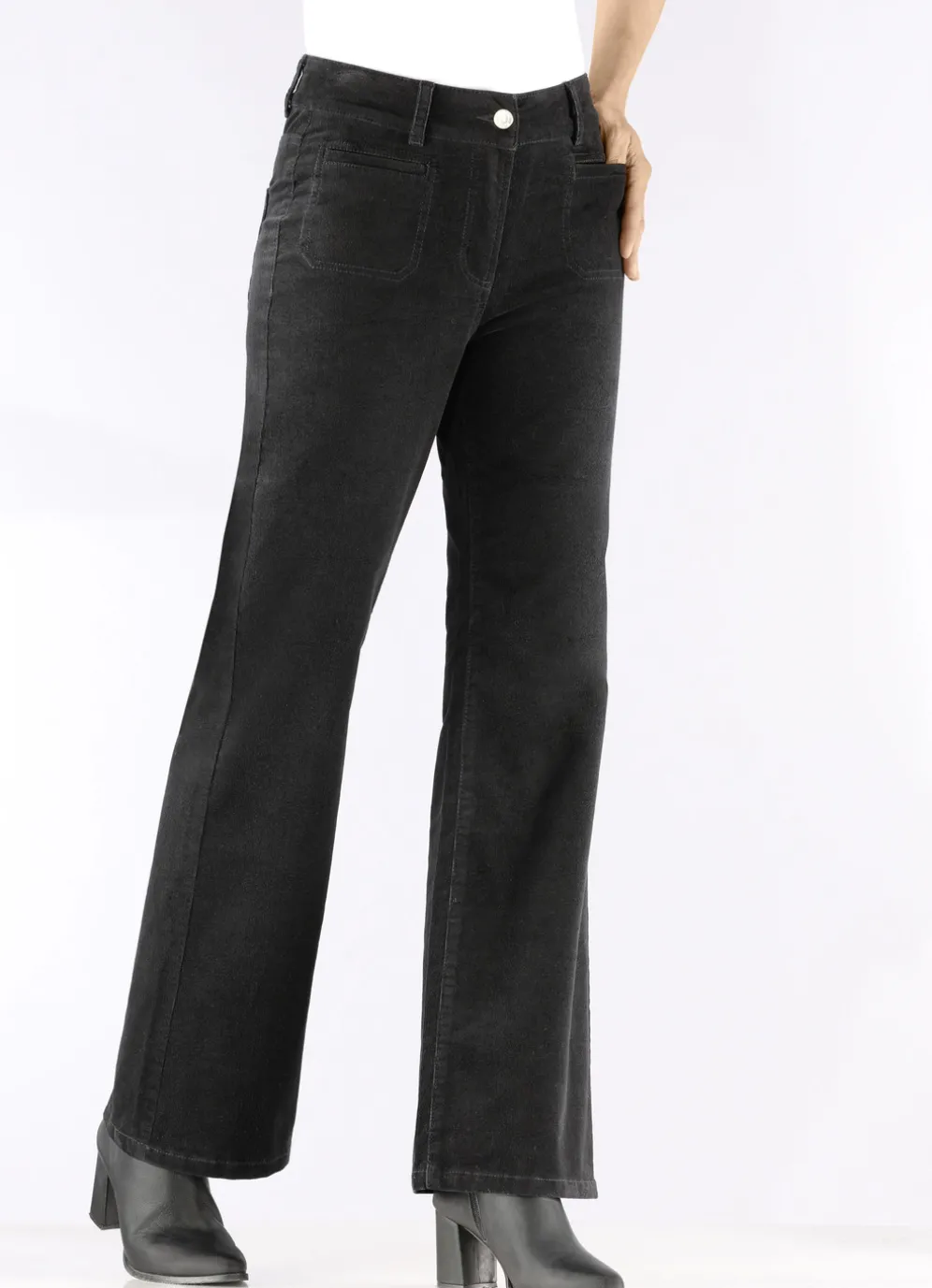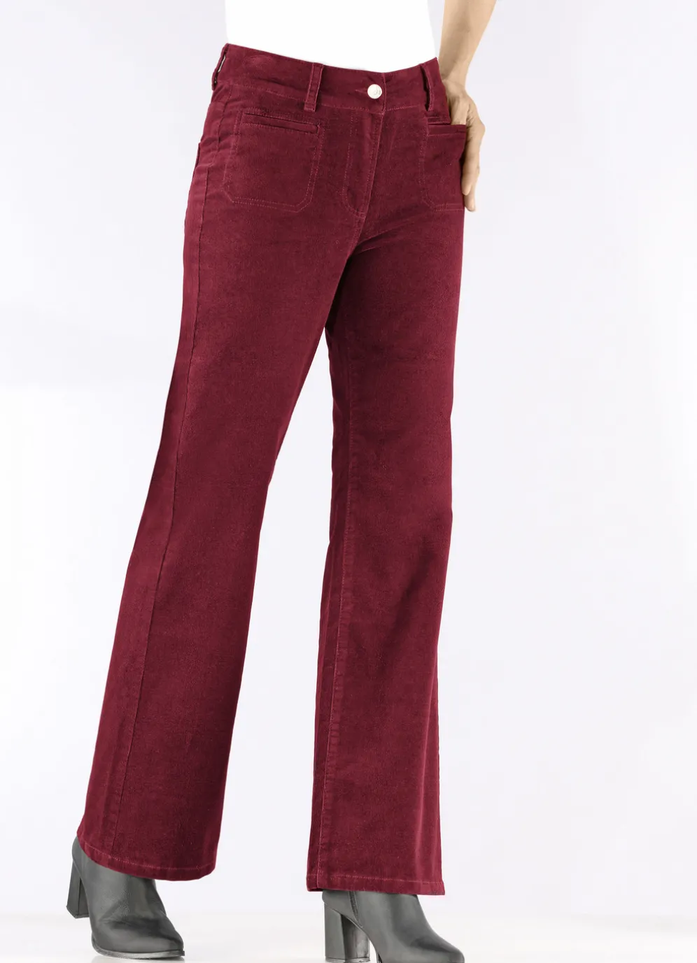 Fabelhafte Cordhose mit weitem Beinverlauf: elastischer Formbund, Gürtelschlaufen, Knopf- und Reißverschluss, modische, aufgesetzte Vordertaschen, Gesäßtaschen sowie figurformende Passe im Rückteil. Innenbeinlänge ca. 78 cm, Fußweite ab 50 cm.