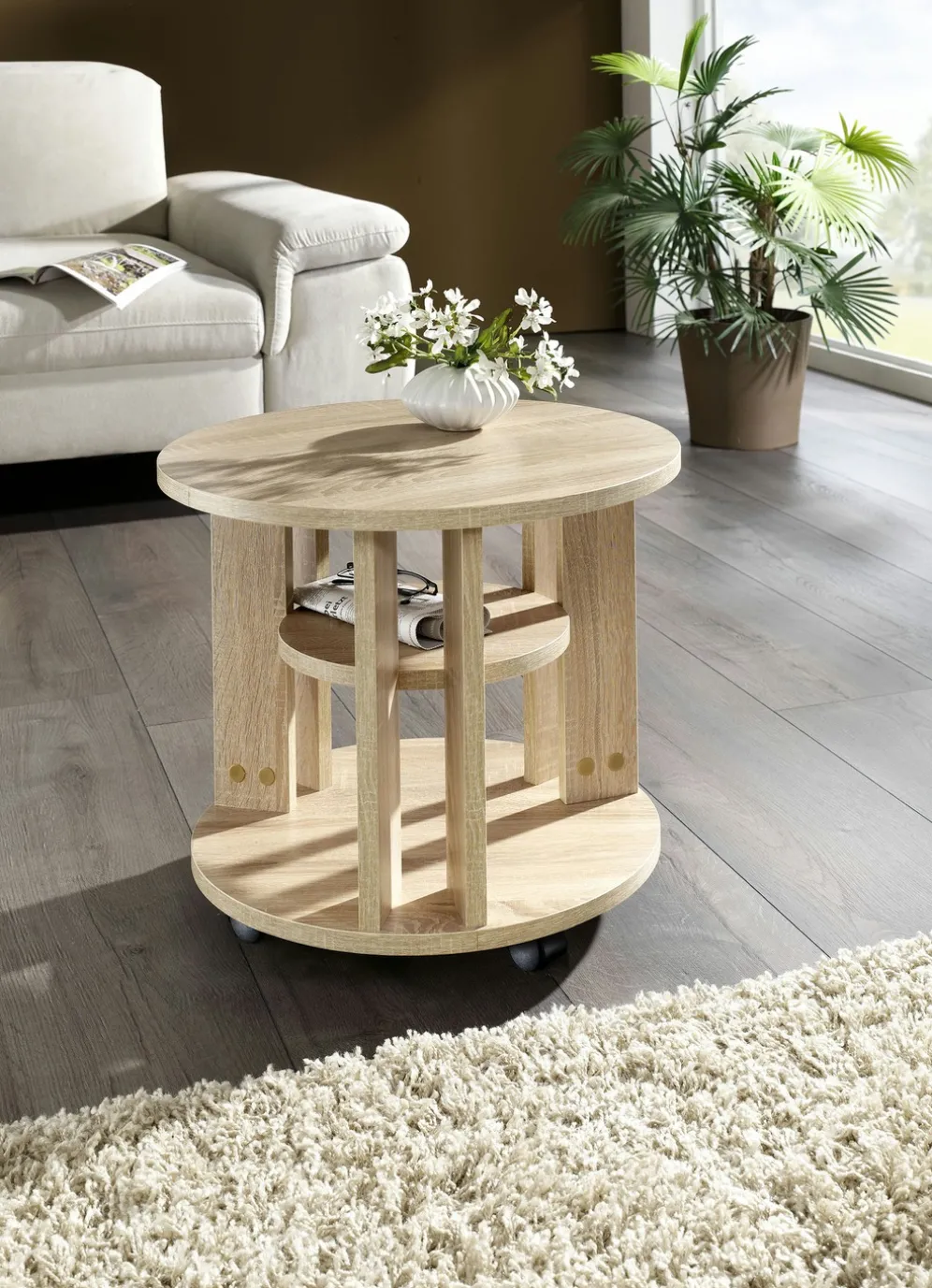 Couchtisch mit 2 Ablageflächen und 4 Rollen in den Maßen ø 50 und in Eiche.