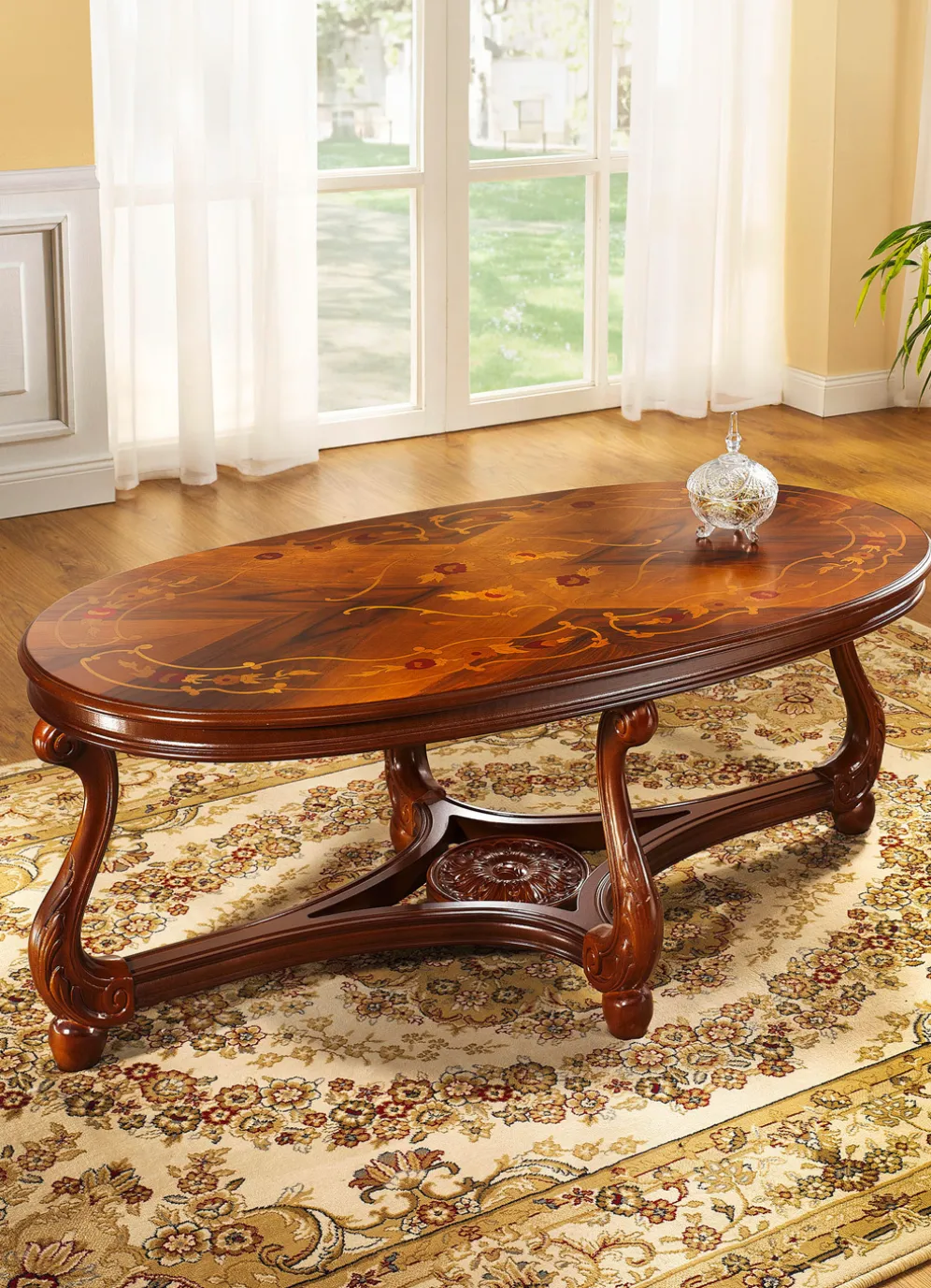 Setzen Sie einen royalen Akzent in Ihrem Wohnraum! Mit diesem schön gearbeiteten, teilmassiven Couchtisch gelingt Ihnen das spielend. Das filigran geschwungene Gestell mit reichhaltiger Schnitzerei aus nussbaumfarbenem Buchenholz wird veredelt durch die hochwertig gestaltete Tischplatte, die mit kunstvollen Intarsien gearbeitet ist. Maße: B119xH47xT63 cm. Die Lieferung erfolgt aufgebaut