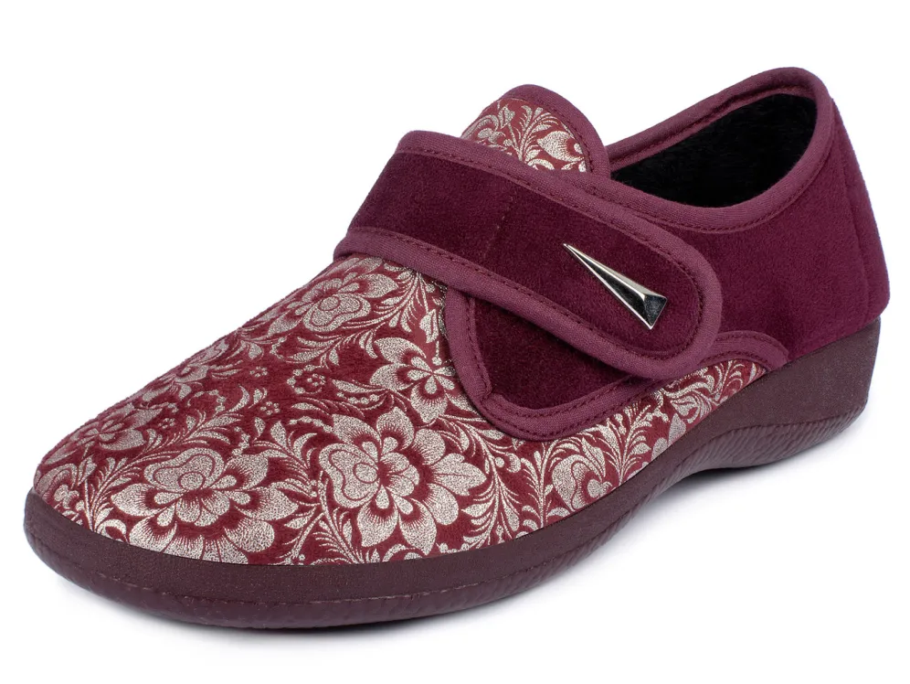 Damen Klett-Halbschuh im Blüten-Design in Bordeaux und in Größe 39.