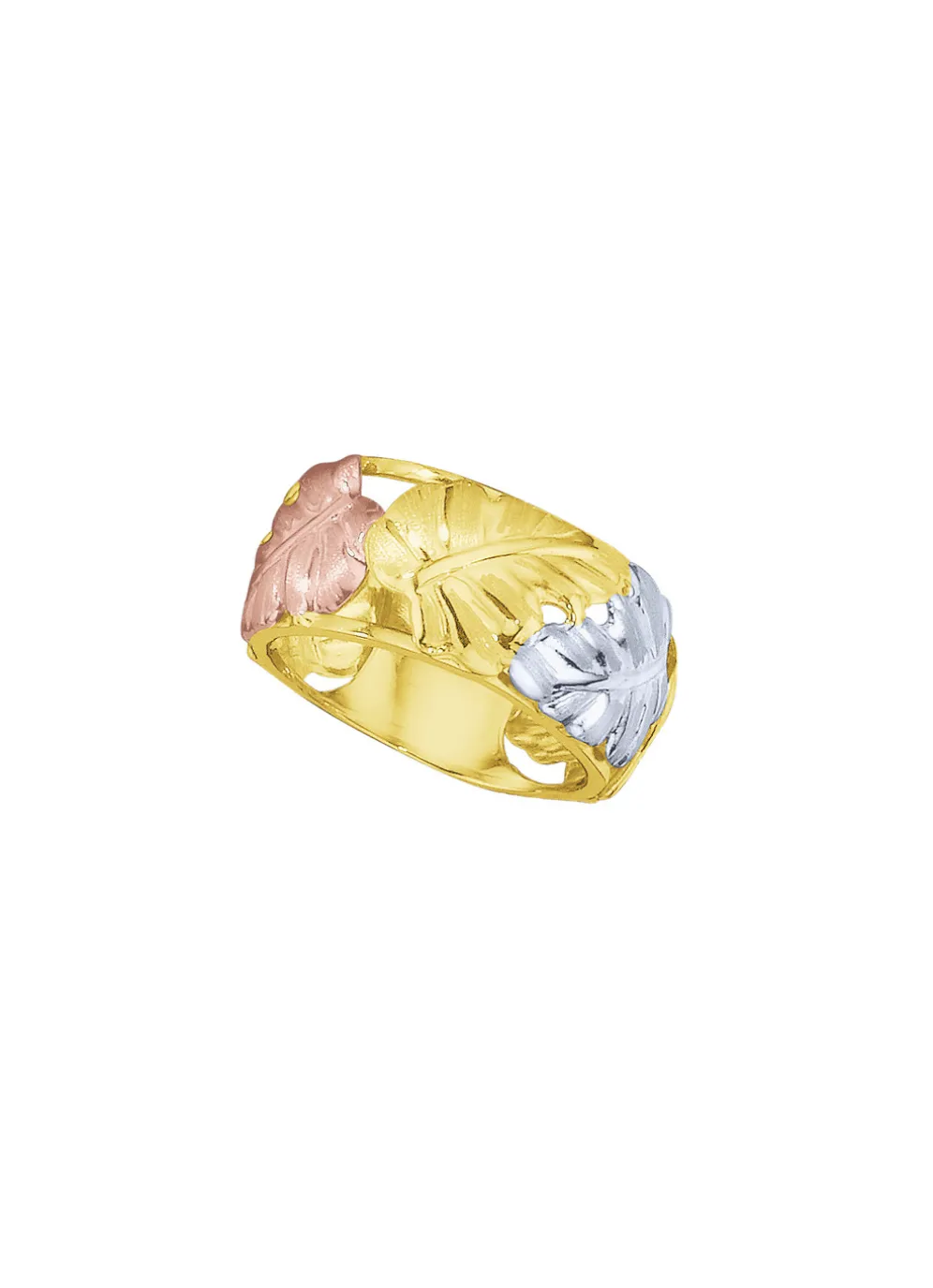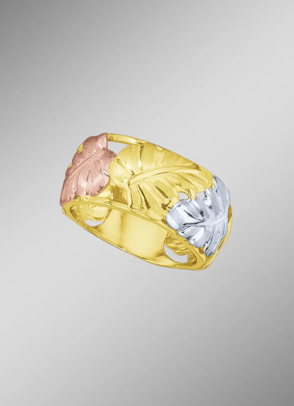 Modisches Blätter-Design in Tricolor, edel und stilvoll inszeniert, ein Statement für die Ewigkeit. Dieser schicke, 12 mm breite Damenring aus Gold 585/- fein, oder Gold 375/- fein ist ein zeitloses Schmuckstück für jede modebewusste Frau und ein bezaubernder Begleiter im Alltag.