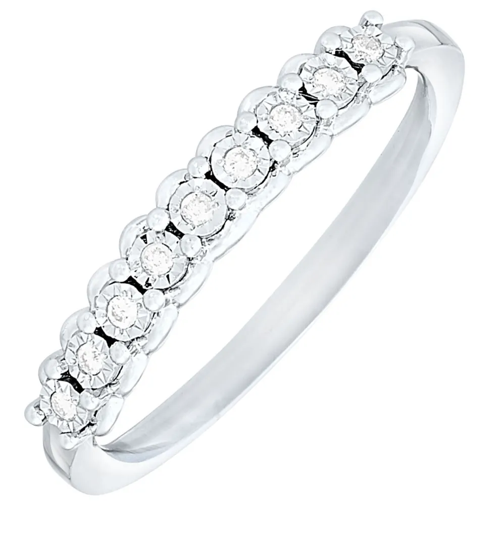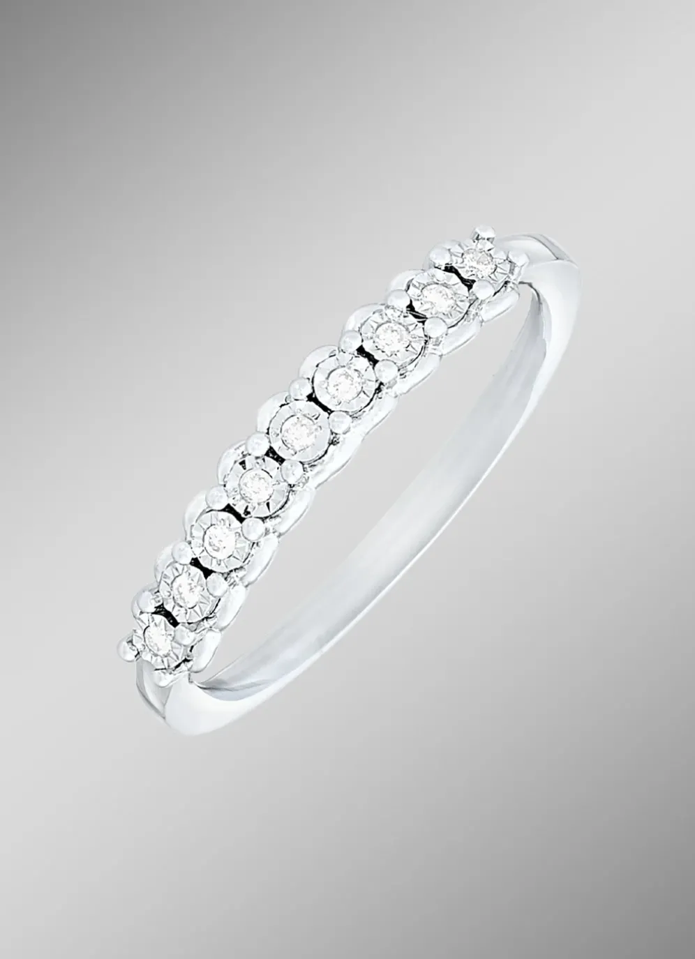 Zeitlos und elegant zugleich ist dieser zarte Damenring aus Weißgold 585/- fein. Er wurde mit 9 Brillanten, Weiß, Piqué 2, veredelt. Das funkelnde, 3 mm breite Schmuckstück lässt Sie strahlen und ist genau das passende Accessoire für ein eleganten und zeitlosen Look.
