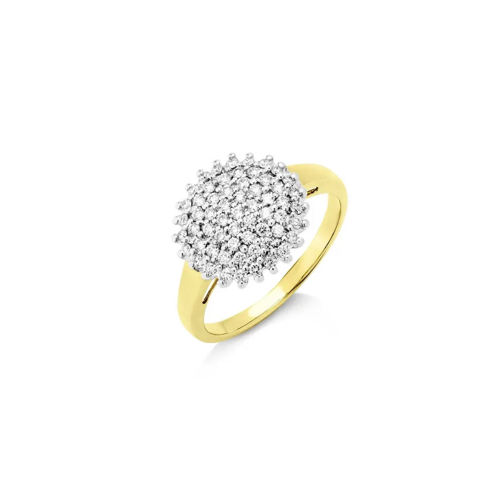 Dieser Brillant-Ring lässt jedes Frauenherz höher schlagen. Er ist aus Gold 585/- fein hergestellt und mit 60 Brillanten zusammen 0,50 ct., Weiß, SI, versehen. Der Ringkopf hat einen Durchmesser von 13 mm. Dieser zauberhafte Damenring funkelt und blitzt bei jeder Bewegung.