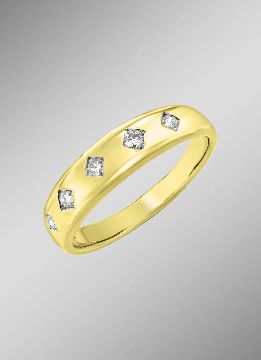 Erleben Sie zeitlose Schönheit mit diesem glänzenden Damenring aus Gold 585/- fein. Dieser exquisite Ring ist mit fünf funkelnden Brillanten in Weiß, Piqué 1, besetzt, die zusammen ca. 0,22 Karat ergeben. Der Ringkopf mit einem Durchmesser von 5 mm verleiht diesem Schmuckstück eine elegante und dennoch dezente Ausstrahlung. Perfekt für besondere Anlässe oder als täglicher Begleiter, der jedem Outfit einen Hauch von Luxus verleiht.
