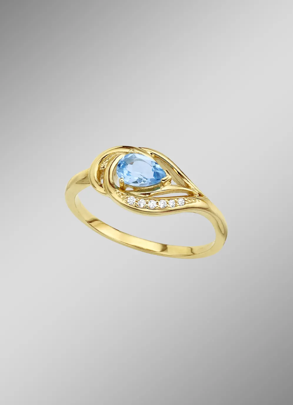 Dieser zauberhafte Damenring ist in Gold 585/- fein oder Gold 375/- fein erhältlich. Der 8 mm breite Ringkopf trägt einen leuchtenden, beh. Blautopas in Tropfenform, welcher durch seine schimmernden Facetten und sein unendliches Strahlen überzeugt. An der geschwungene Ringschiene glitzern synth. Zirkonia.