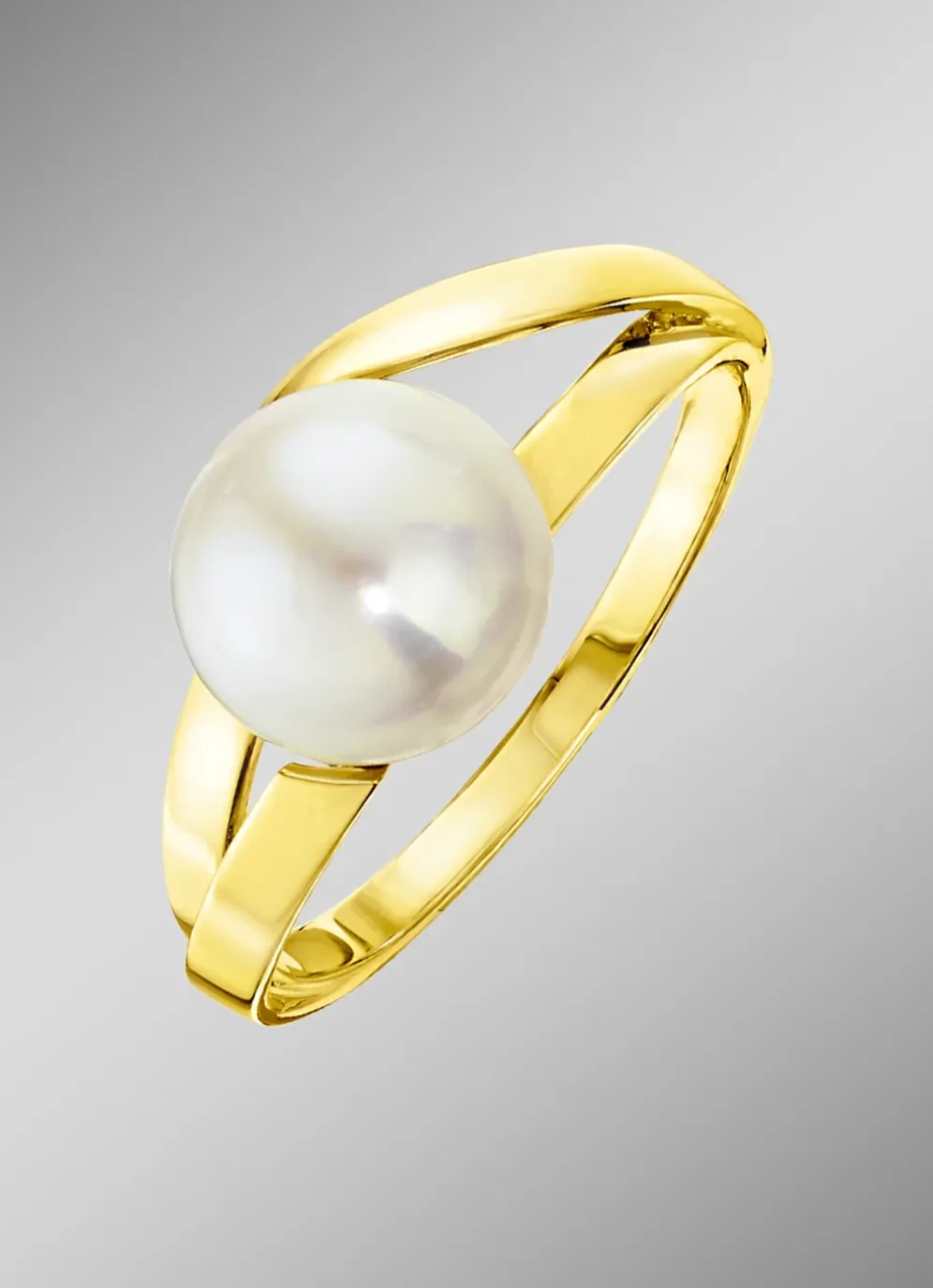 Im eleganten Design zeigt sich dieser Damenring wahlweise in Gold 585/- fein oder in Gold 333/- fein. Strahlender Mittelpunkt ist ein 8 mm Süßwasser-Zuchtperlen-Bouton.