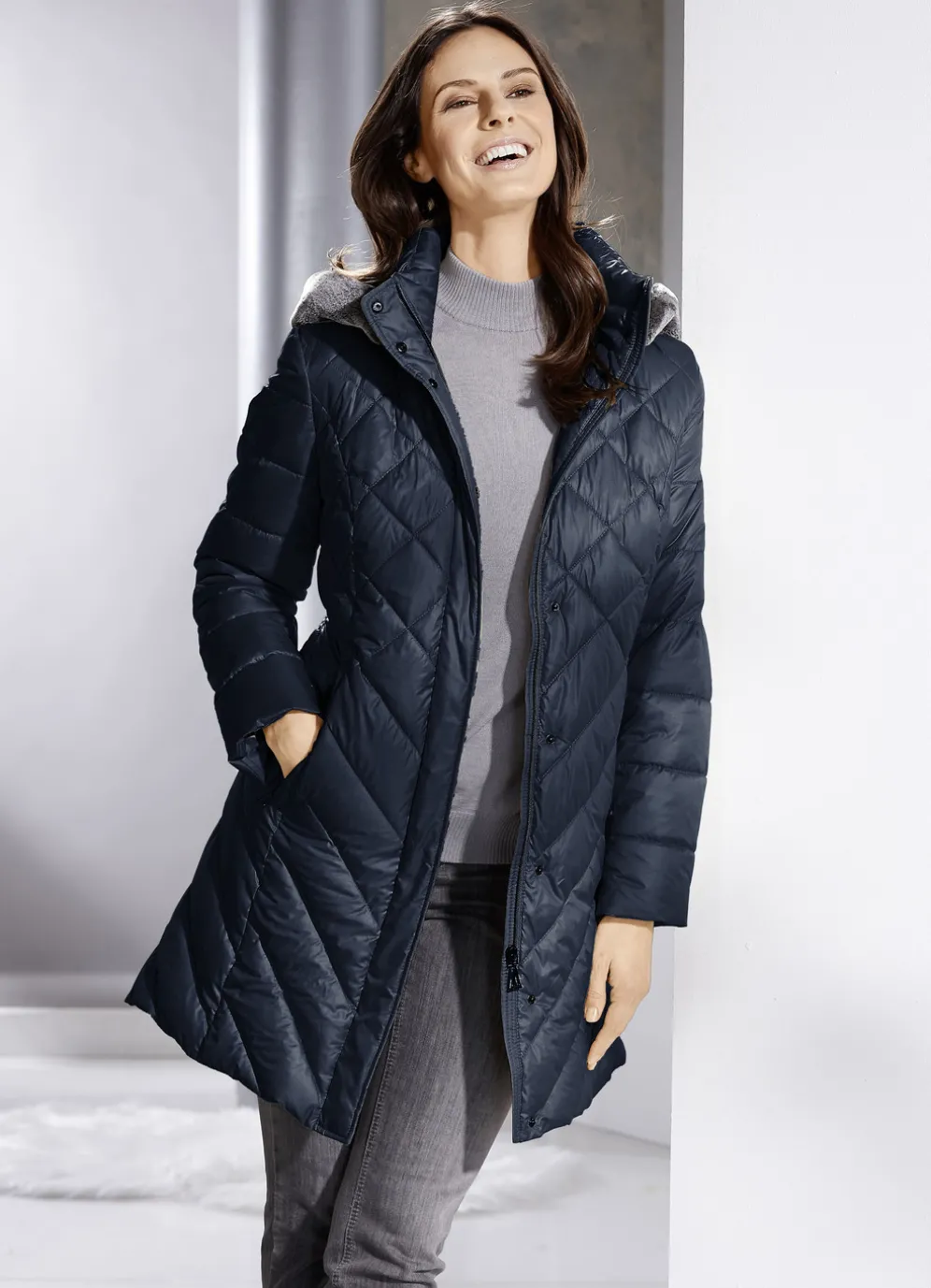 Ein Modell der Extraklasse ist dieser modische Daunen-Kurzmantel: abnehmbare Kapuze mit Kunstpelz-Innenausstattung, durch Reißverschluss unter verdeckter Druckerleiste hoch schließbarer Stehkragen, verdeckte Reißverschlusstaschen, Reißverschluss an den Seitenschlitzen, umschlagbare Ärmel sowie eine Innentasche. Länge ca. 90 cm.