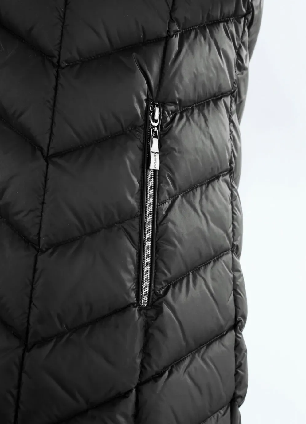 Große Klasse ist diese schwarze Daunenjacke: abnehmbare Kapuze mit Durchzugsband und Stopper sowie abnehmbarem Kunstpelz-Besatz, durch 2-Wege-Reißverschluss unter der Druckerleiste hoch schließbarer Stehkragen, Reißverschlusstaschen, Ärmelabschlüsse mit Windfang aus Rippenstrick sowie eine Innentasche. Länge ca. 80 cm, ab Gr. 46 ca. 82 cm.