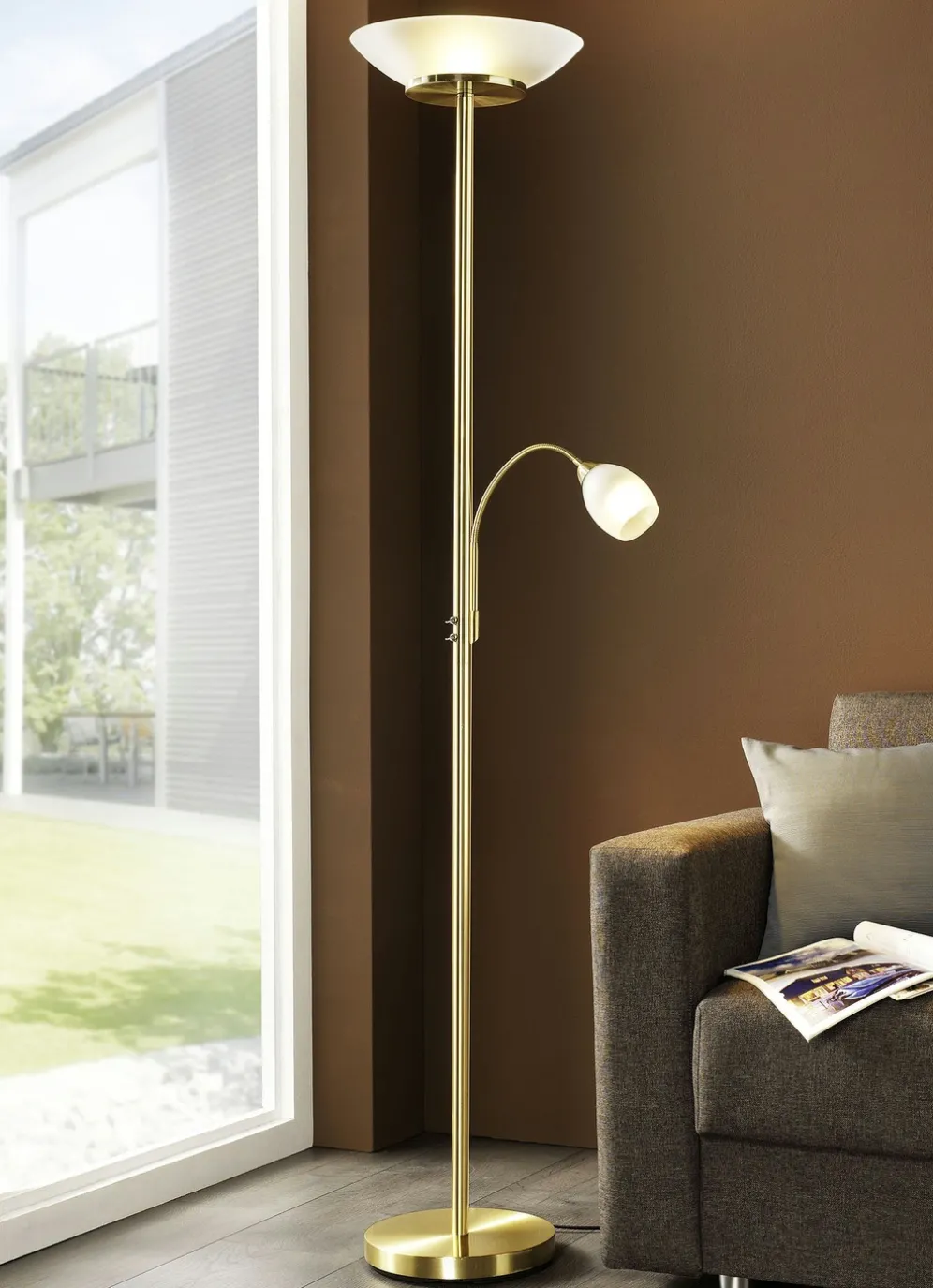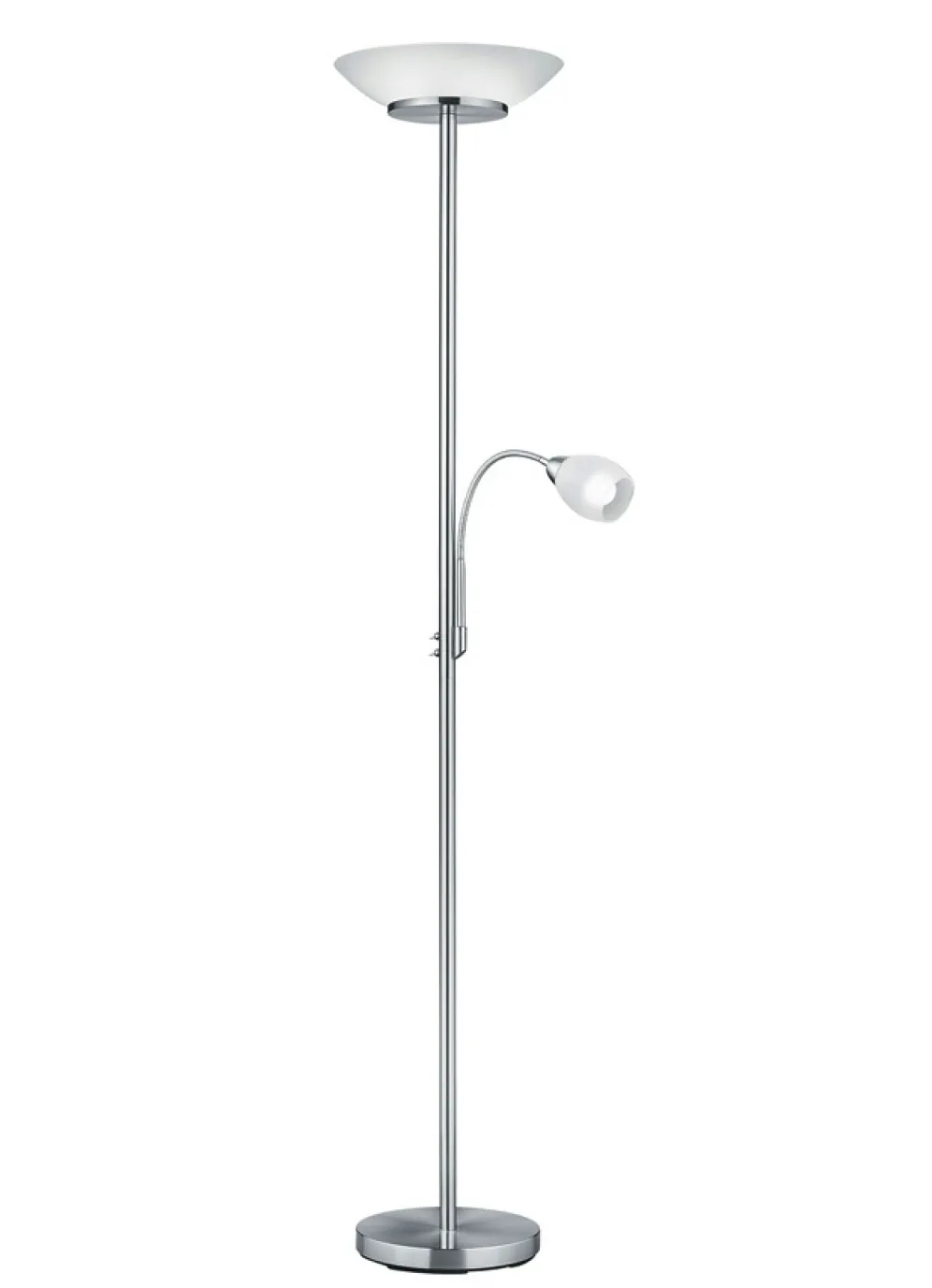 Schicker Deckenfluter mit separat zuschaltbarem, flexiblem Lesearm. Fassung 2x E27, je max. 18 Watt, Lesearm 1xE14, max. 10 Watt, 230 Volt. Lieferung erfolgt ohne Leuchtmittel. Maße: ø 34 cm, Höhe 180 cm. Mit Aufbau- Anleitung.