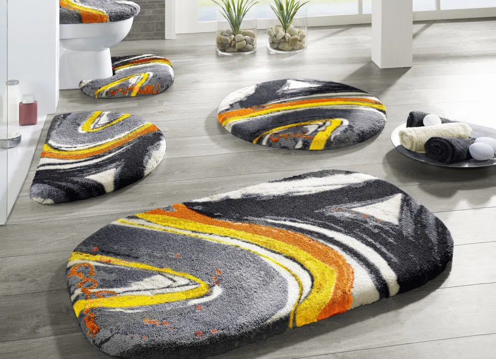 Fantastische Designer-Badgarnitur aus dem Hause „GRUND“, nach den Entwürfen des berühmten Künstlers Prof. Luigi Colani. Rückseite rutschhemmend beschichtet sowie besonders kuschelige Florhöhe von 24 mm. Die traumhaft weiche Qualität: 100% Polyacryl „Supersoft“. Waschbar bis 40 °C und für Trockner und Fußbodenheizung geeignet