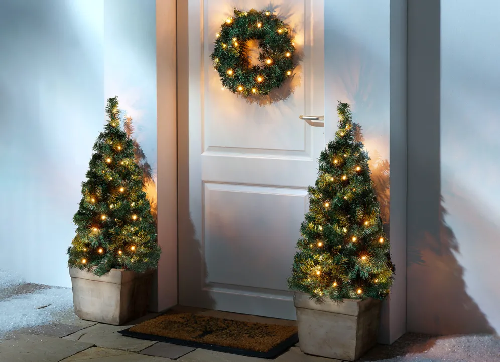 Die perfekte Dekorationsidee bestehend aus 2 Tannenbäumchen und 1 Kranz ist ideal für einen winterlich gestalteten Eingangsbereich. Natürlich können Sie die Bäumchen auch in Blumenkästen oder auf der Terrasse arrangieren. Der Kranz schmückt sowohl Fenster, als auch Türen.