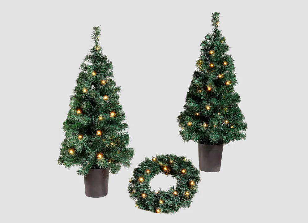 Integrierte LEDs lassen die Tannenbäumchen und den Kranz stimmungsvoll erleuchten. Aus Kunststoff. Mit Ein-/ und Ausschalter. Batteriebetrieben mit je 3x AA (nicht im Lieferumfang enthalten). Maße: Kranz ø 45 cm; Höhe je Tannenbaum 90 cm