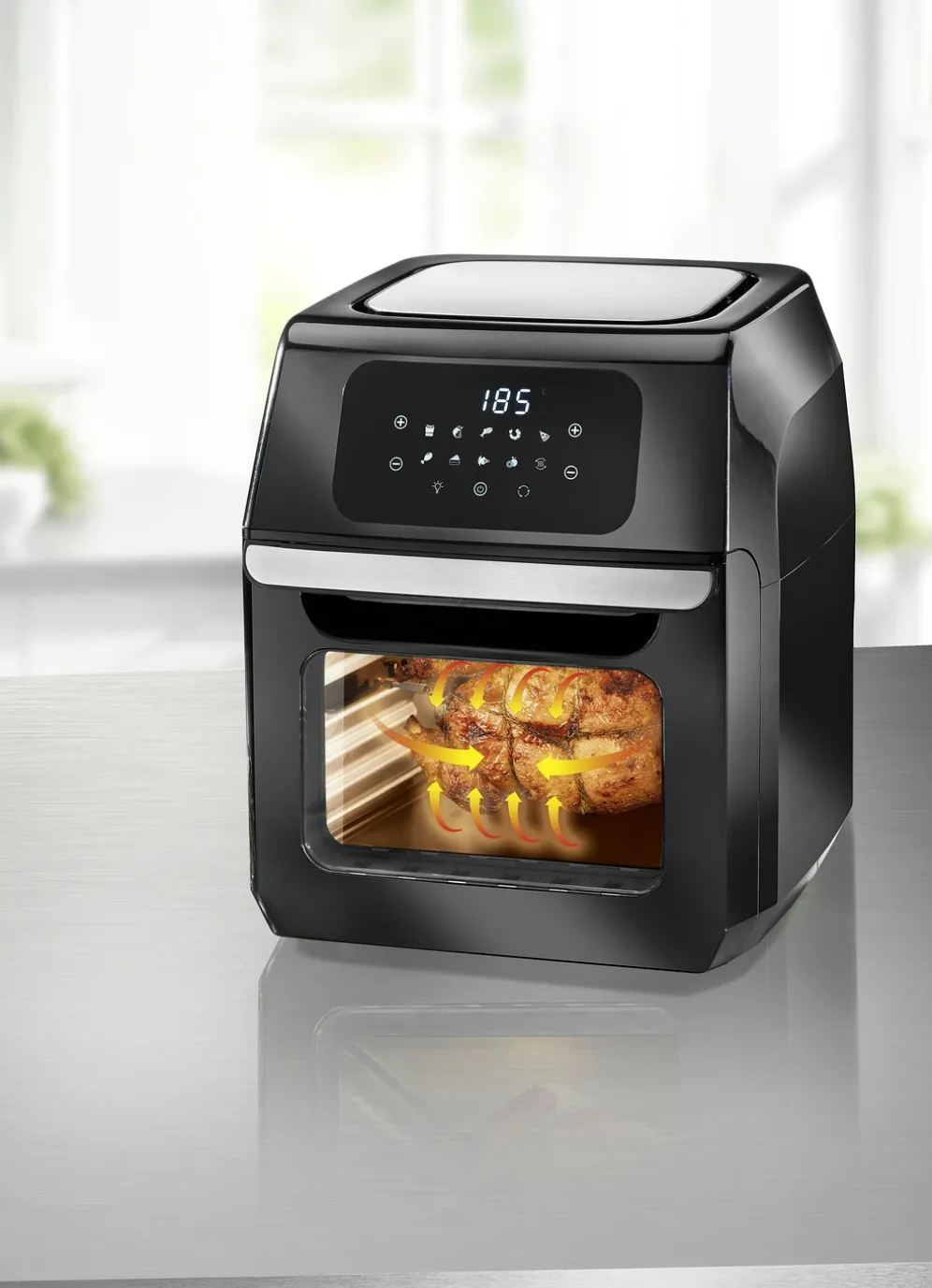 Mit 10 automatischen Programmen (Pommes frites, Steak/Koteletts, Fisch, Schrimps, Pizza, Hähnchen, Backen, Drehgrillen, Dörren, Aufwärmen). Mit Touchdisplay. Temperatur einstellbar von 80 °C bis 200 °C. Timerfunktion bis zu 90 Minuten, mit automatischer Abschaltung. 3 Ebenen. Umfangreiches Zubehör: Drehspieß, Pommeskorb, 3 Gitter und Fettauffangschale. Herausnehmbare Teile sind spülmaschinengeeignet. Anti-Rutsch-Füße. Extra großes Fassungsvermögen 12 Liter, 1800 Watt. Inkl. Rezepten. Maße: B32,5xH37xT37,5 cm. Innenmaße: B25,5xH20cmxT23 cm. 3 Jahre Herstellergarantie