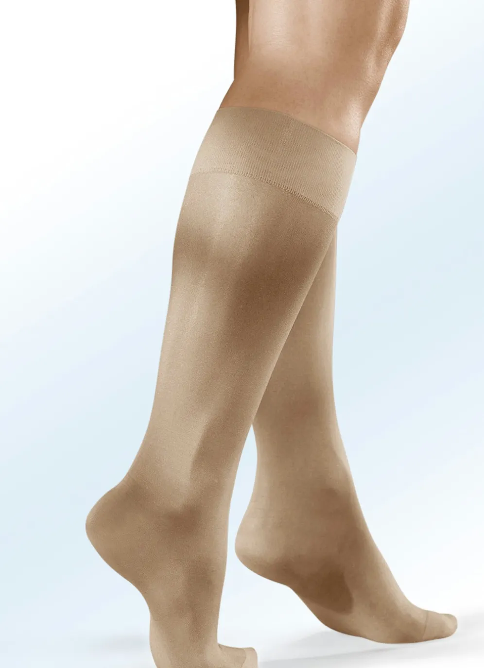 Vitalisierende und sanft massierende „disée“-Stützkniestrümpfe mit verstärkter Spitze und formgestrickter Pendelferse für die korrekte Positionierung der graduellen Massagestufe. 70den