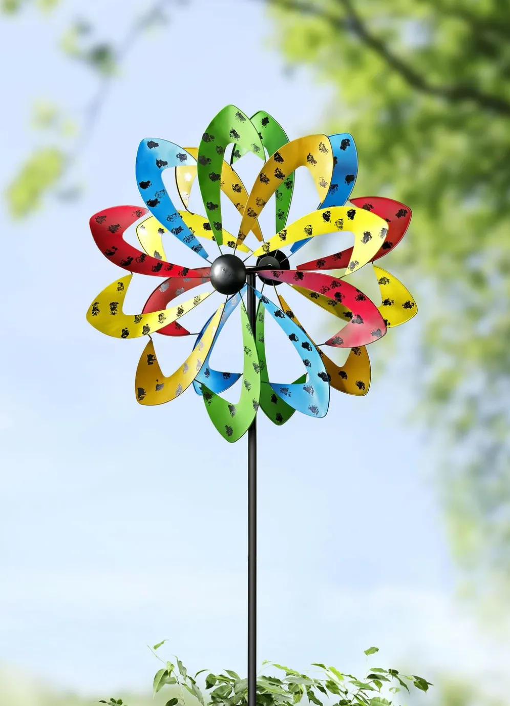 Mit diesem bunten, schön designten Doppel-Windrad aus Metall erhalten Sie ein hübsches und außergewöhnliches Accessoire für Ihren Garten. Durch den Erdspieß läßt sich das Windrad gut im Boden verankern.