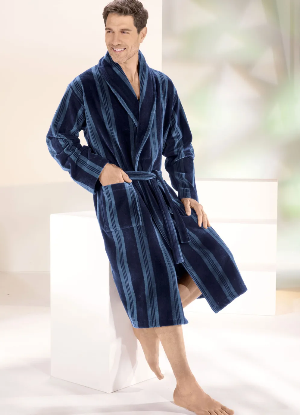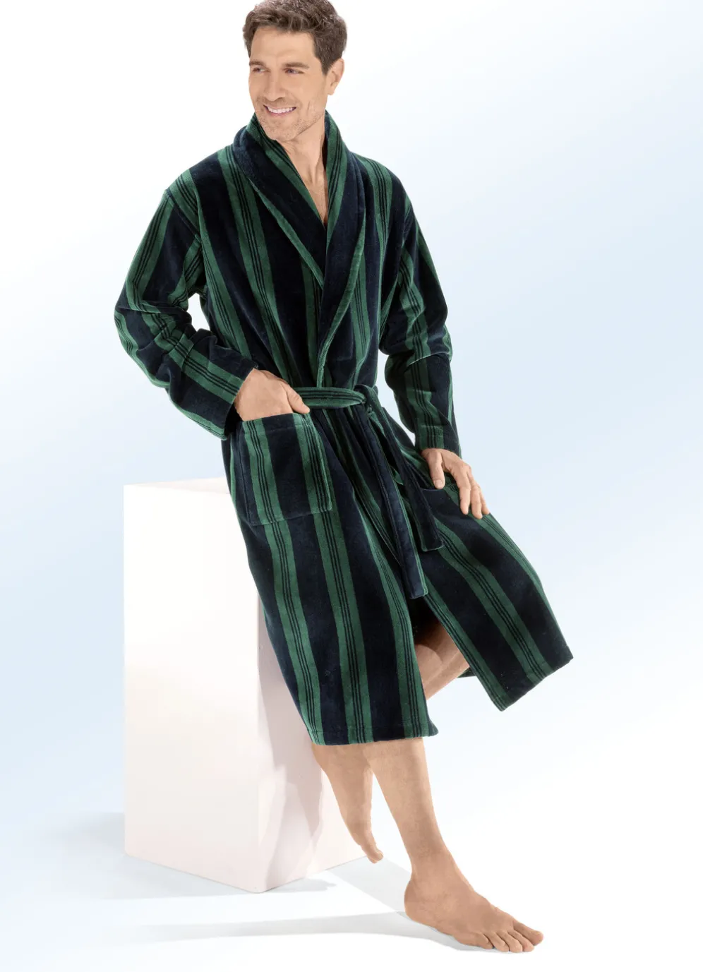 Als idealer Begleiter für entspannte Stunden zeigt sich dieser tolle Doubleface-Bademantel in wadenlanger Form, mit Schalkragen, zwei aufgesetzten Taschen sowie Gürtelschlaufen und Bindegürtel.