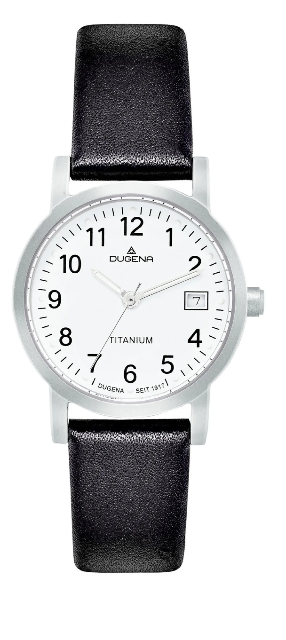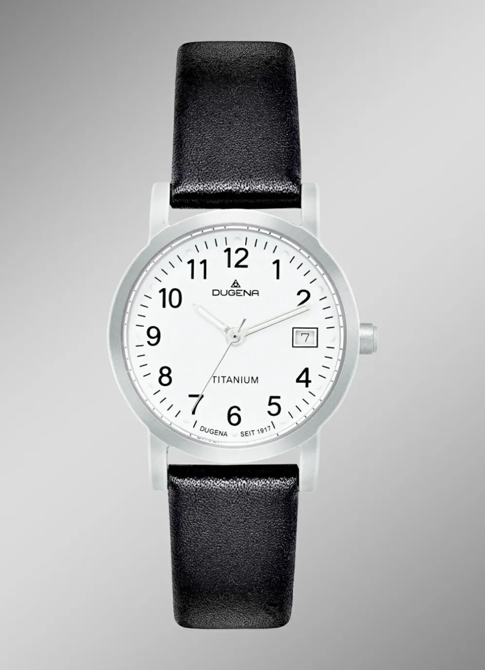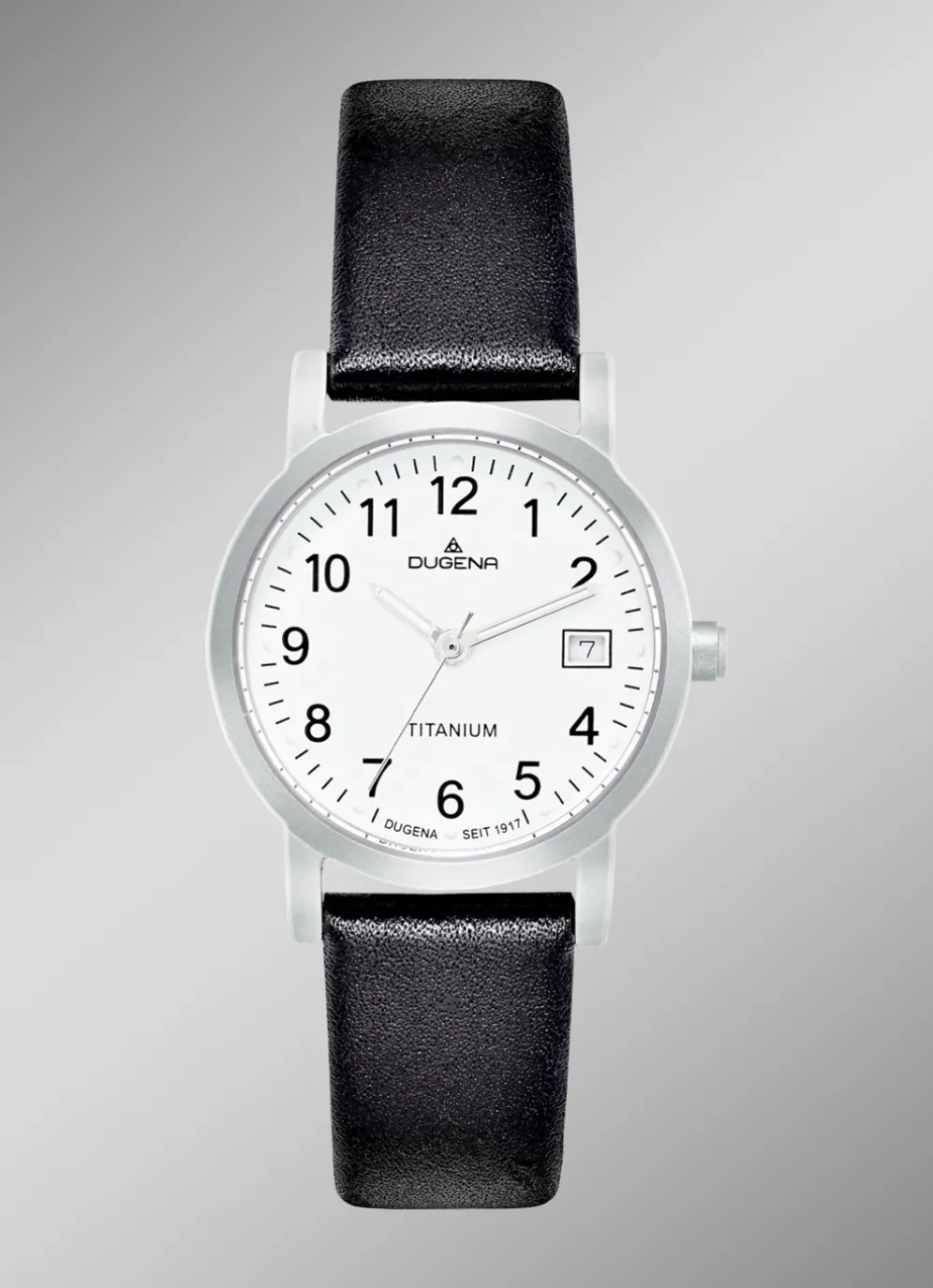 Klassische Damenuhr mit Titangehäuse, schwarzem Lederband und Mineralglas. Die Uhr hat ein gut ablesbares Zifferblatt und eine Datums-Anzeige.