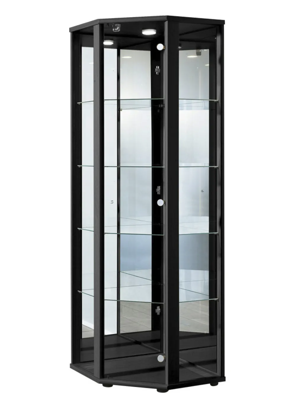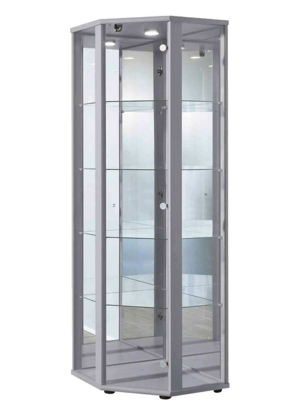 Eck-Vitrine mit LED-Beleuchtung in Weiss.