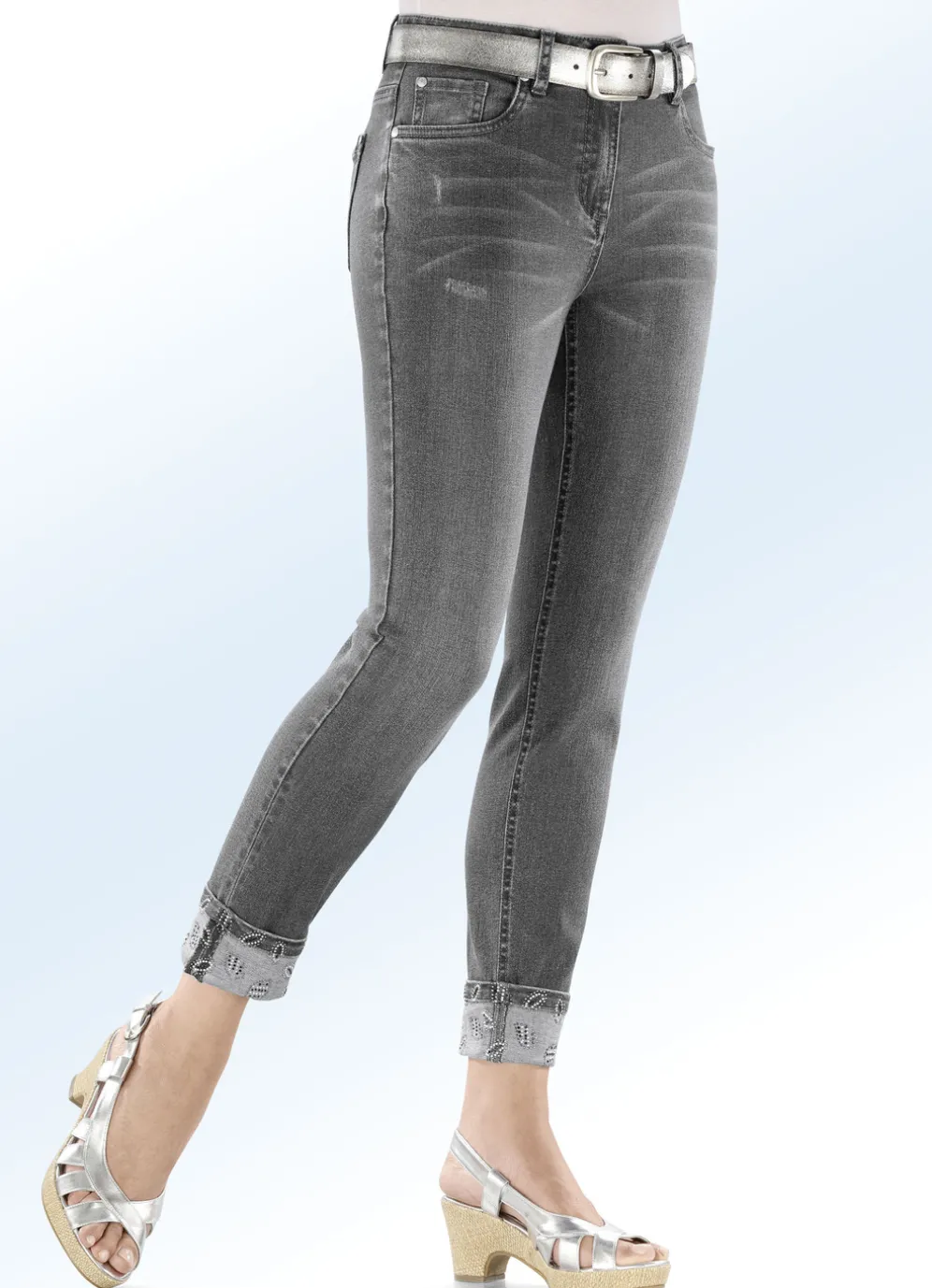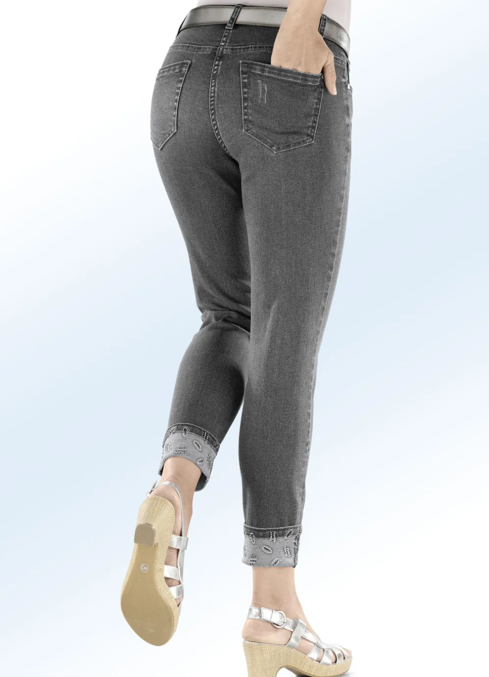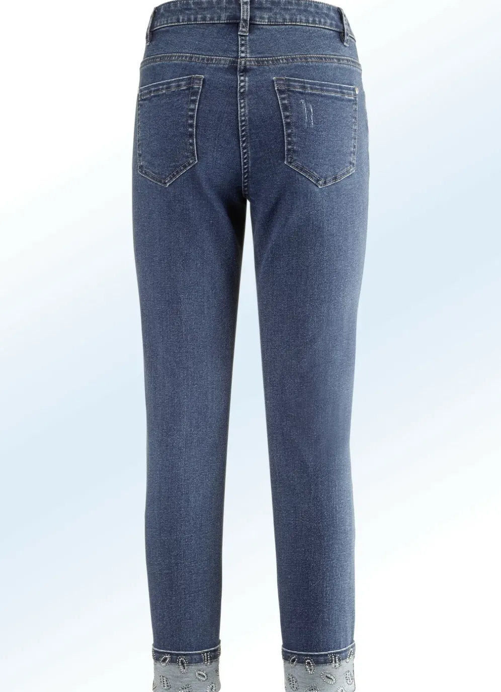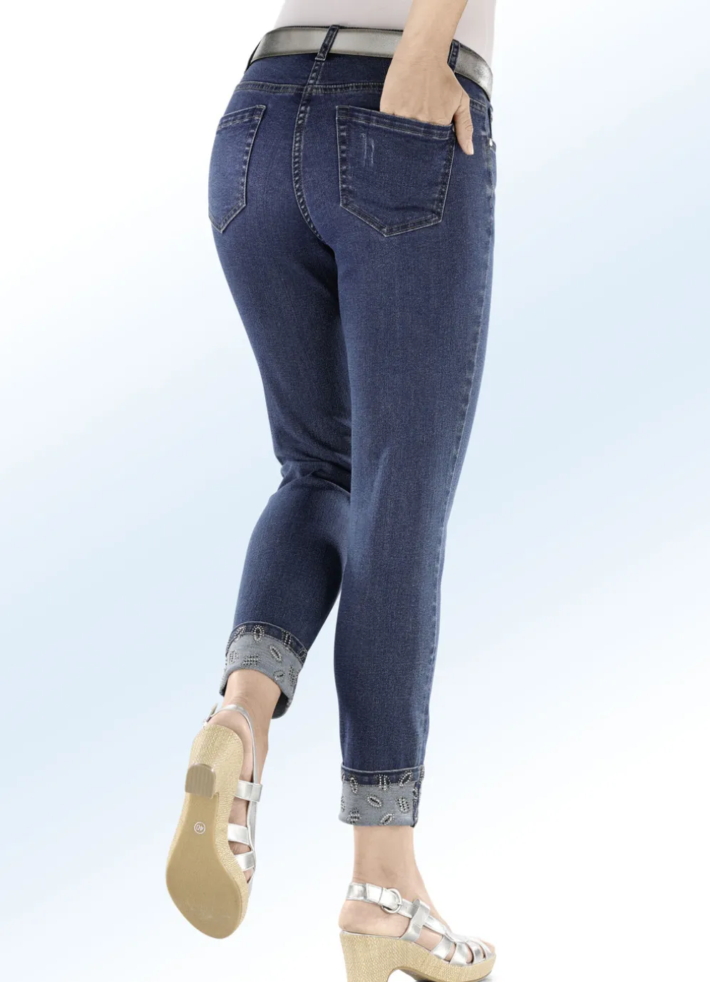Der hübsche, funkelnde Glitzersteinchenbesatz rundum auf den fixierten Aufschlägen verwandelt diese schicke 7/8-lange Edel-Jeans in 5-Pocket-Form in einen echten Hingucker: elastischer Bund, Gürtelschlaufen, Knopf- und Reißverschluss, Ziernieten an allen Taschen, tolle Destroyed-Effekte allover sowie dezente Auswasch-Effekte und Jeanssattel. Innenbeinlänge ca. 66 cm.