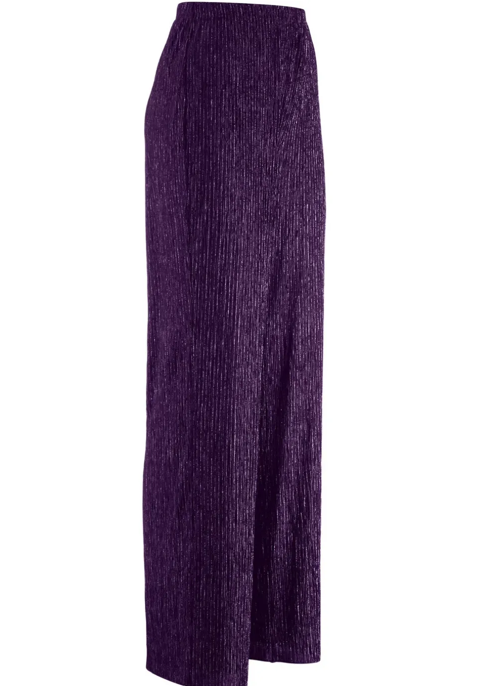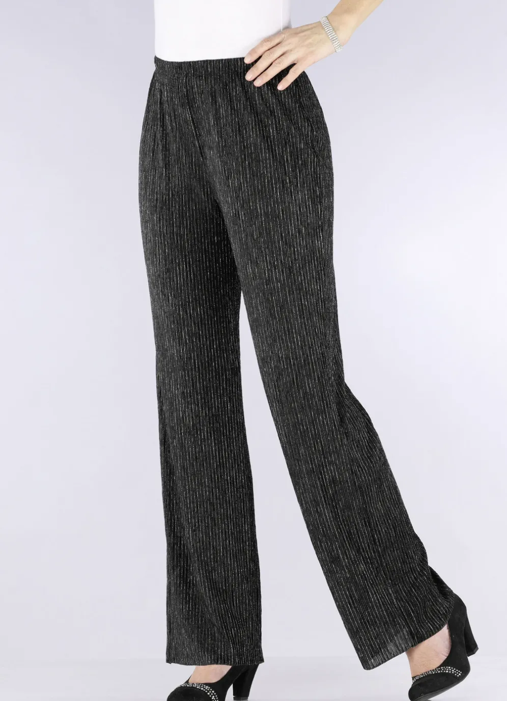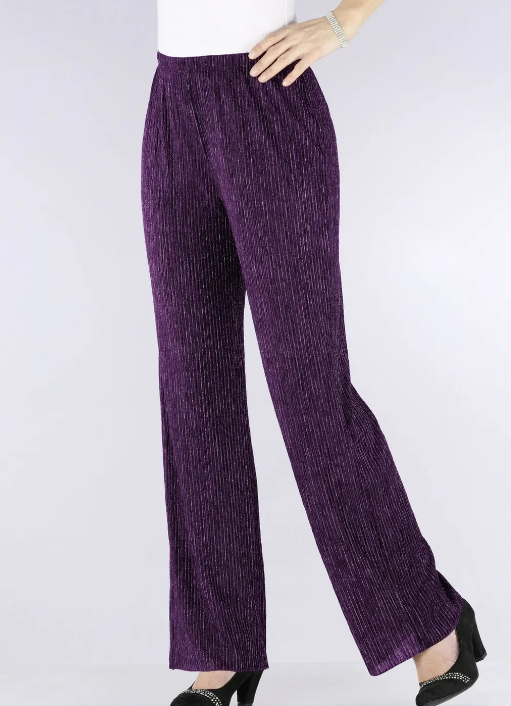 Exquisite, edel schimmernde Hose in bequemer Weite sowie komfortabler Schlupfform mit Dehnbund rundum. Innenbeinlänge ca. 78 cm. Fußweite ab 50 cm.