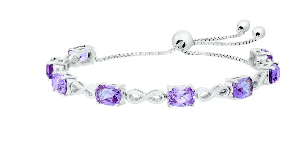 Dieses edle Armband ziert das weibliche Handgelenk auf gekonnte Art und Weise. Das Accessoire aus Silber 925/- fein ist mit echten Amethysten verziert. Die Breite beträgt 5,5 mm, die Länge ist verstellbar bis 25 cm. In zarter Eleganz lenkt das Schmuckstück die Blicke auf sich und wird im Nu zum neuen Lieblingsaccessoire stilbewusster Damen