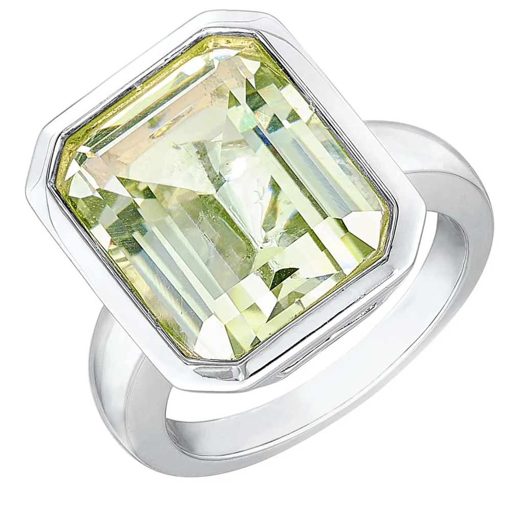 Effektvoller Damenring aus Silber 925/- fein mit echt grünem Amethyst im 18 mm breiten Ringkopf. Der Edelstein funkelt wunderschön. Dieser klassische Damenring ist faszinierend
