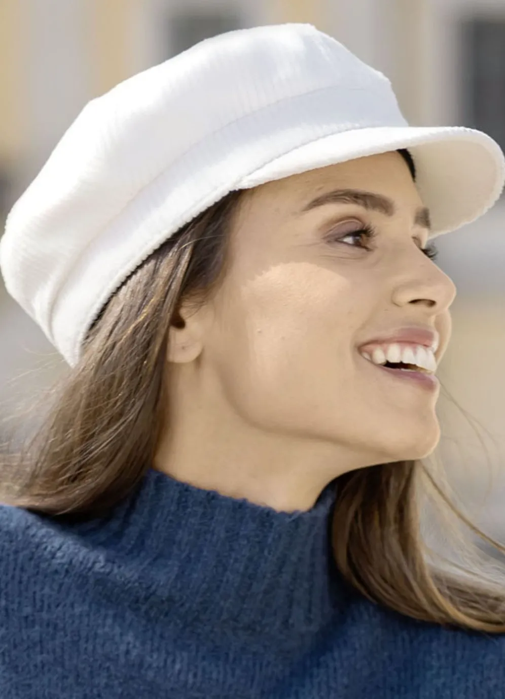 Elegante Damen-Ballonmütze, mit rückwärtigem Elastikeinsatz in Weiss.