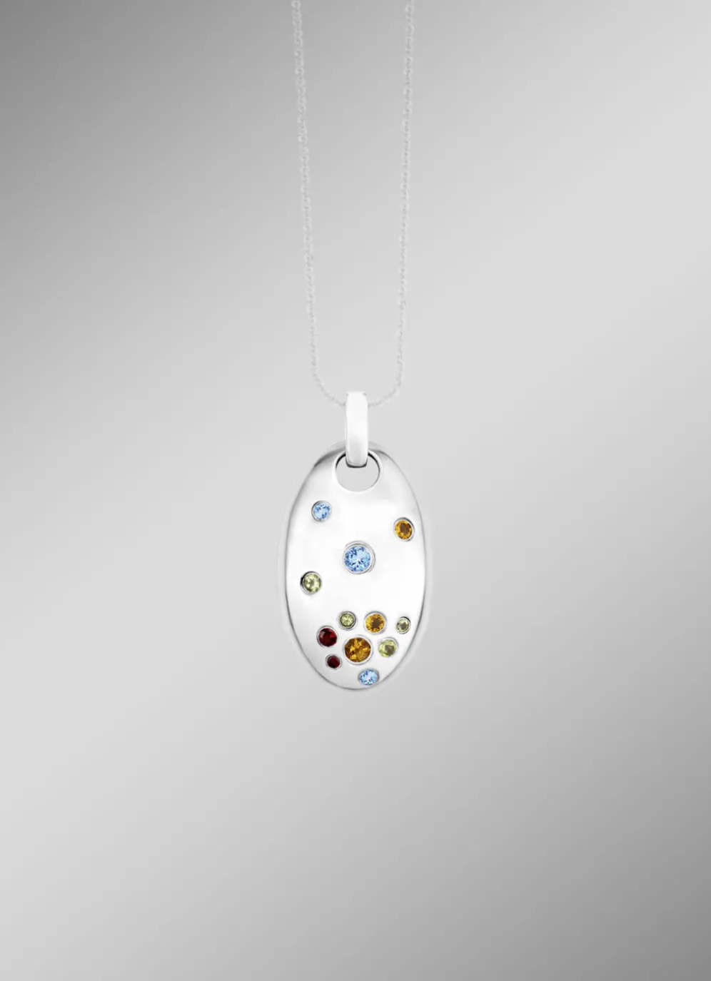 Entdecken Sie die zeitlose Schönheit dieses Anhängers aus Silber 925/- fein, rhodiniert für eine glänzende und langlebige Oberfläche. Dieser ovale Anhänger, mit den Maßen 37×18 mm, ist mit echten Edelsteinen – Citrin, Peridot, Granat und Baby-Blautopas, beh. – besetzt, die in ihrer Farbvielfalt und Brillanz beeindrucken.