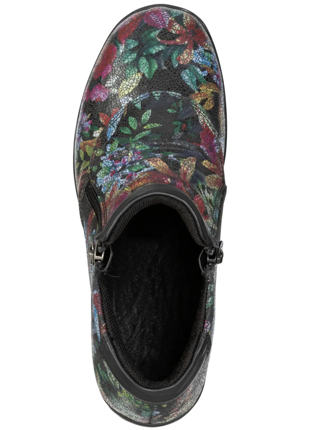 Boots von ELENA EDEN aus Nappaleder, in Schwarz-Bunt mit zart glänzender Floral-Prägung: Weite H, Raffung, zwei praktische Reißverschlüsse, Textilfutter, herausnehmbares Lederfußbett, leichte PU-Riffelsohle sowie 30 mm Keilabsatz. Schafthöhe ca. 8 cm