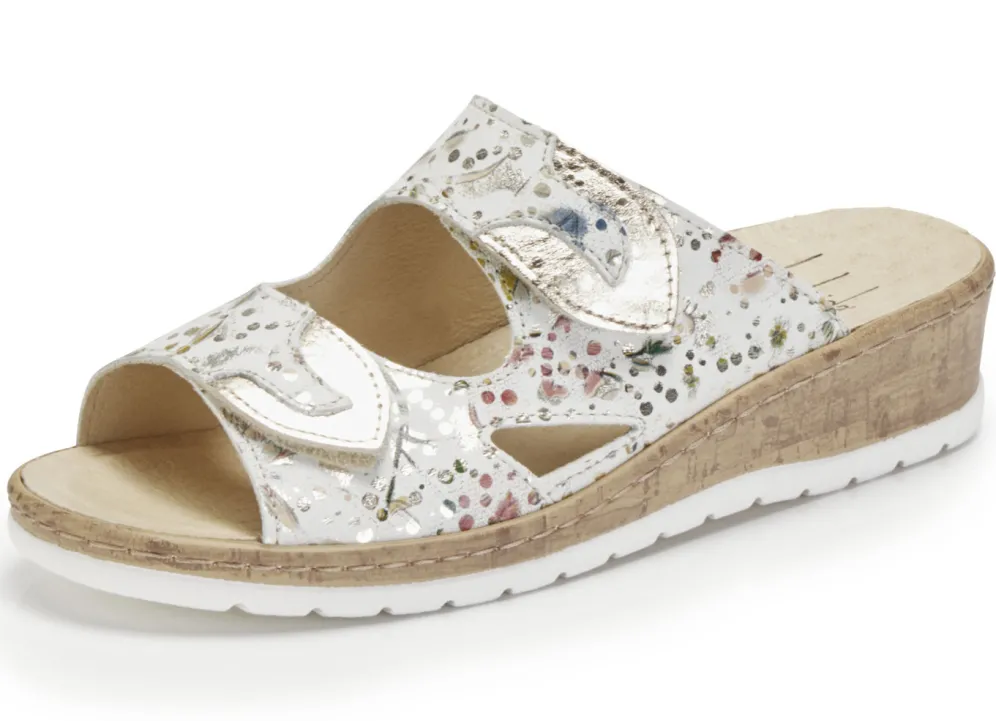 Pantoletten von ELENA EDEN aus schimmernd bedrucktem Nappa- oder Veloursleder: Weite H, zwei Klettspangen, Lederfutter, herausnehmbares Leder-Kork-Fußbett, leichte PU-Profilsohle, 30 mm Keilabsatz