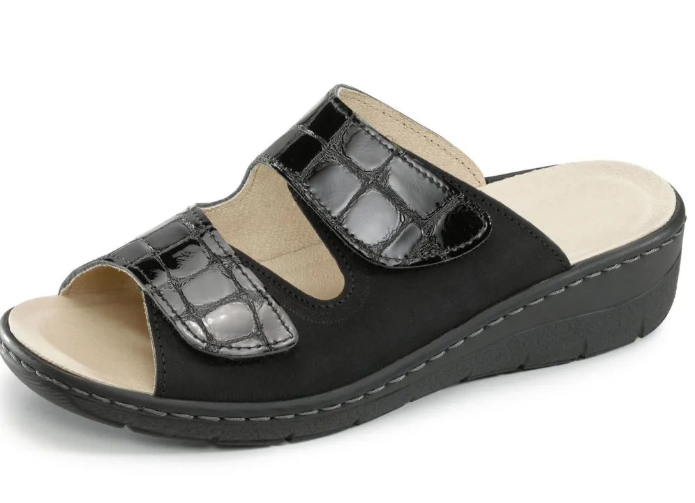 Pantoletten von ELENA EDEN, aus Nubukleder und krokogeprägtem Lackleder: Weite H, zwei Klettspangen, Lederfutter, herausnehmbares Leder-Kork-Fußbett, leichte PU-Laufsohle, 30 mm Keilabsatz