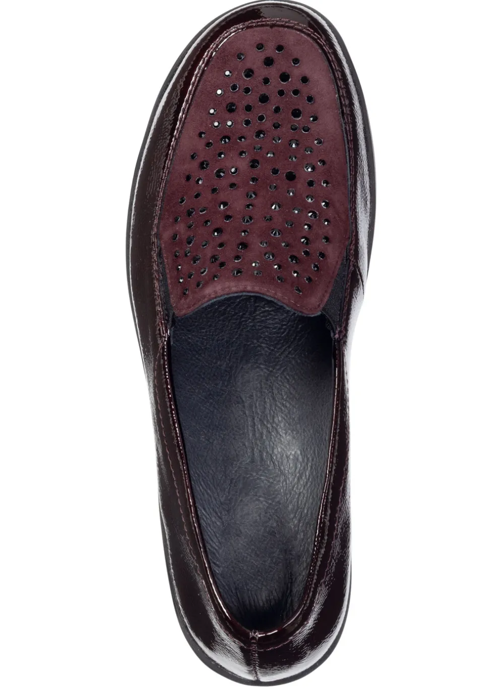 Slipper von ELENA EDEN, aus Lack- und Veloursleder, teilweise mit schwarzen Glitzersteinchen verziert: Weite H, seitlich eingesetzte Gummizüge, ledergefüttertes Quartier, herausnehmbares Lederfußbett, leichte PU-Luftpolster-Profilsohle sowie 25 mm Keilabsatz