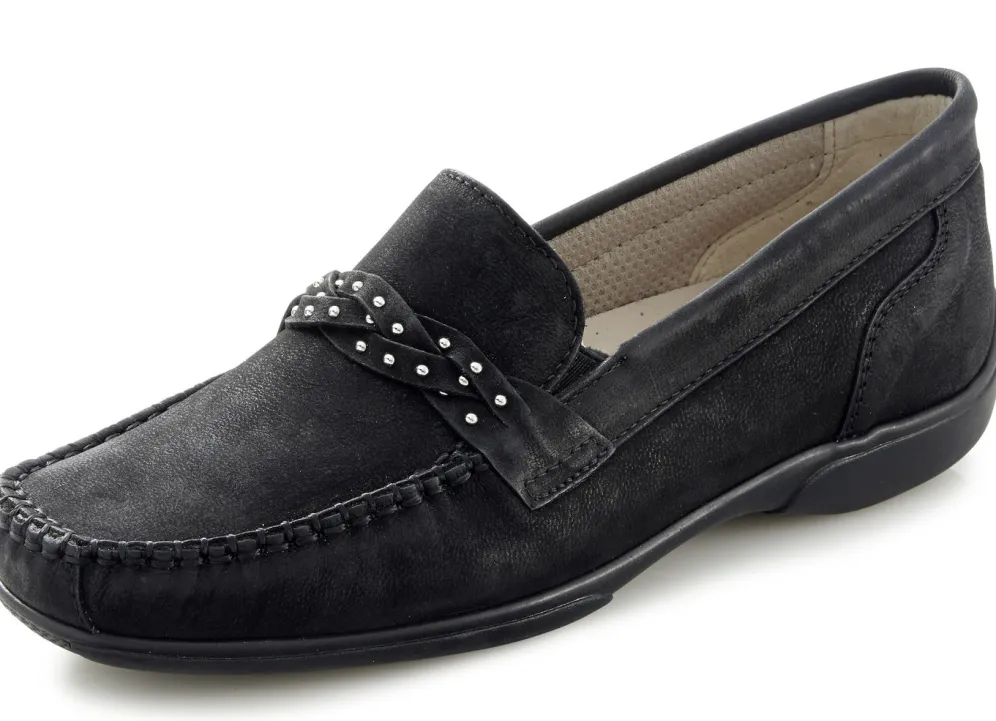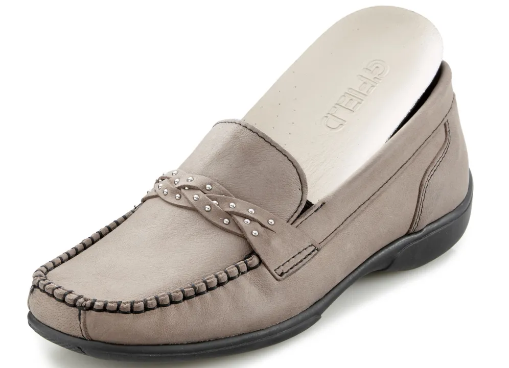 Slipper von ELENA EDEN in Mokassin-Verarbeitung, aus Ziegen-Nubukleder mit nietenbesetzter Spange: Weite H, seitliche Gummizüge, Textilfutter, herausnehmbares Lederfußbett, leichte EVA-Riffelsohle sowie 15 mm Keilabsatz