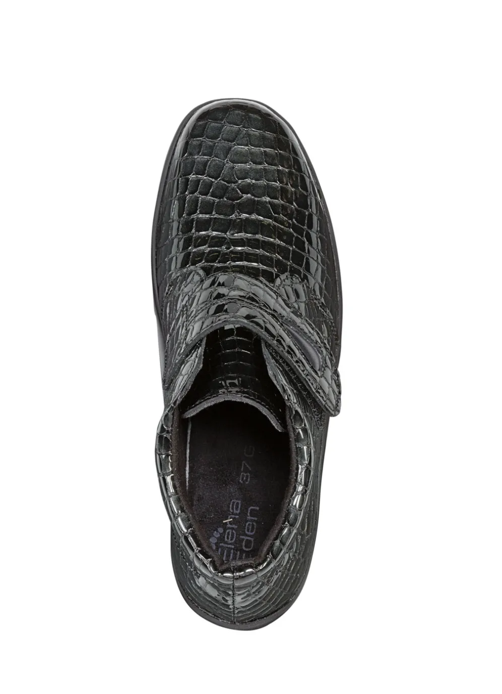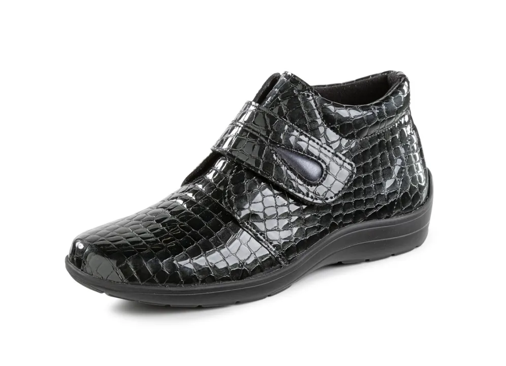 Dunkelgrauer ELENA EDEN-Bootie aus edlem, krokogeprägtem Lackleder, mit verstellbarer Klettspange: Weite H, gepolsterter Schaftrand, Textilfutter, herausnehmbares Fußbett, superleichte TR-Profilsohle sowie 15 mm Keilabsatz. Schafthöhe ca. 8 cm