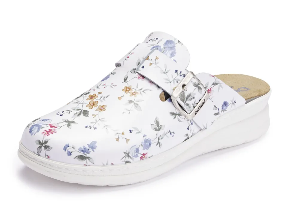 Clogs von ELENA EDEN aus weißem Rind-Nappaleder mit buntem, floralem Druck: in Weite H, verstellbare Spange, herausnehmbares Lederfußbett, PU-Laufsohle sowie 25 mm Keilabsatz