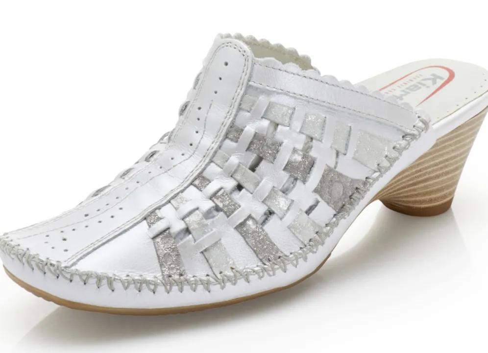 Luftiger Mokassin-Sabot von ELENA EDEN aus Nappaleder, mit teilweise glänzend geprägten Kontrast-Durchzügen: in Weite G, gepolsterte Decksohle, TR-Riffelsohle sowie 45 mm Absatz