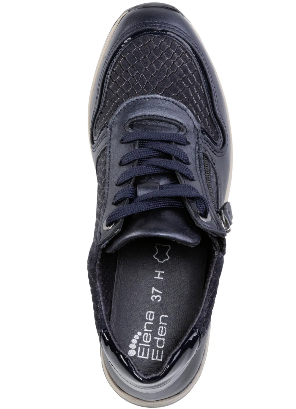 Schnür-Sneaker von ELENA EDEN, aus teilweise geprägtem Veloursleder und Nappaleder, in Dunkelblau mit Lackleder kombiniert: Weite H, Seitenreißverschluss, Futter, herausnehmbares Lederfußbett, leichte TR-Laufsohle sowie 20 mm Keilabsatz