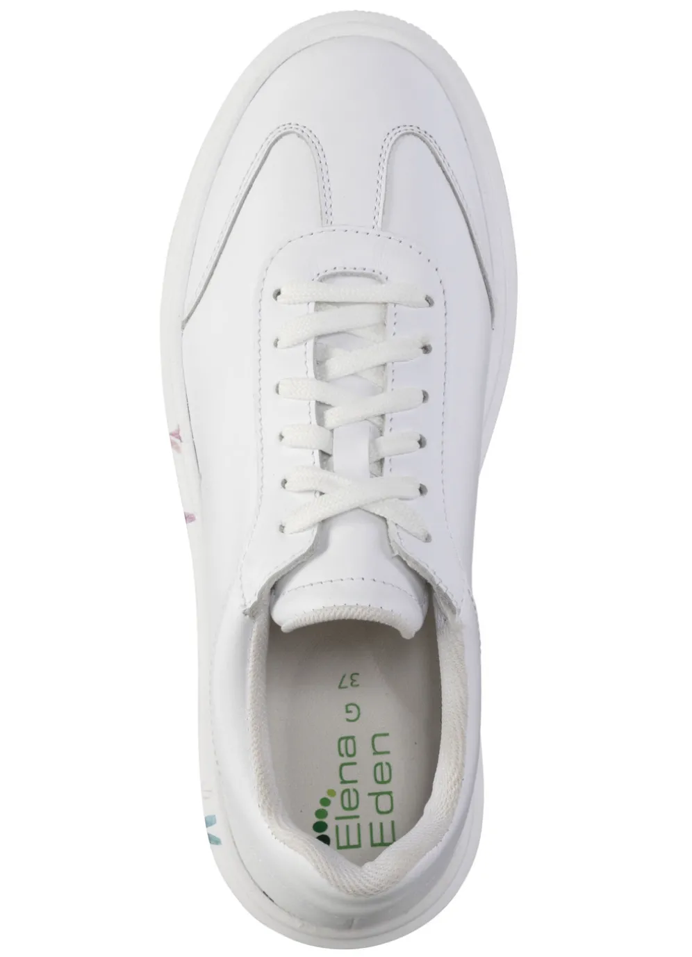 Weißer ELENA EDEN-Sneaker aus Nappaleder, teilweise mit Zier-Perforation: Weite G, Schnürung, gepolstertes Textilfutter, herausnehmbares Fußbett, leichte TR-Laufsohle mit 25 mm Plateau und Blumen-Dessin