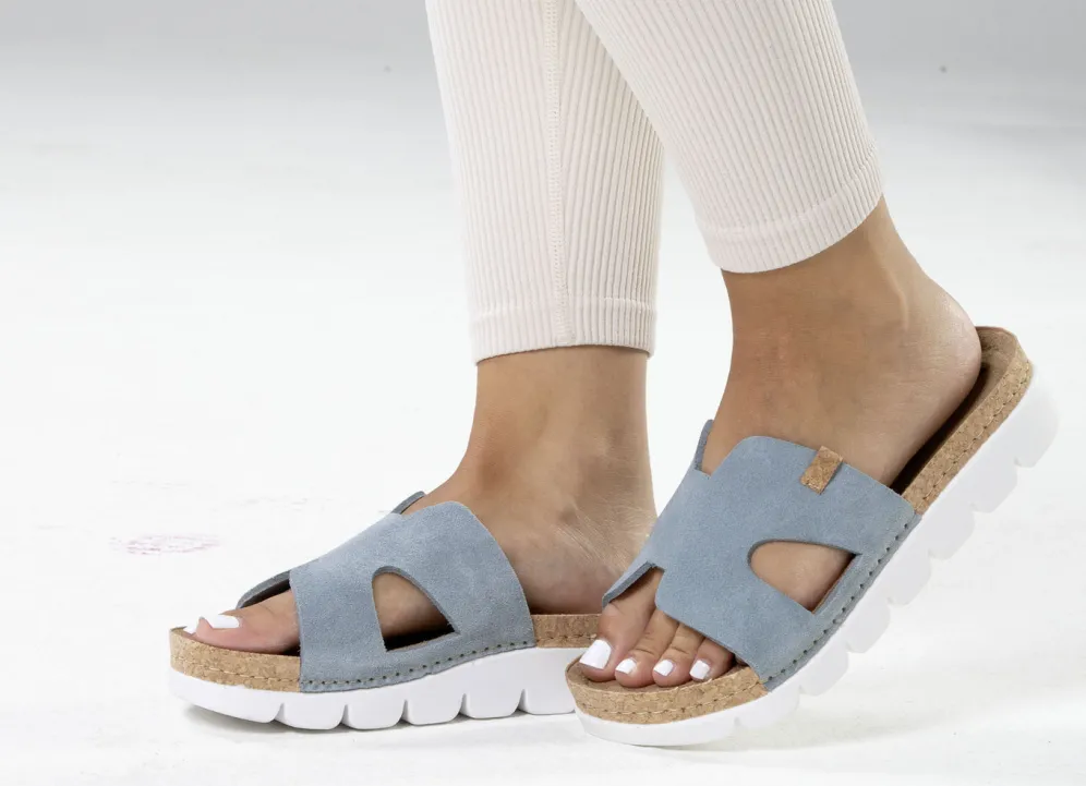 Pantoletten von ELENA EDEN aus Veloursleder: gepolstertes Lederfußbett mit korkbezogenem Rahmen, leichte PU-Profilsohle, 10 mm Keilabsatz