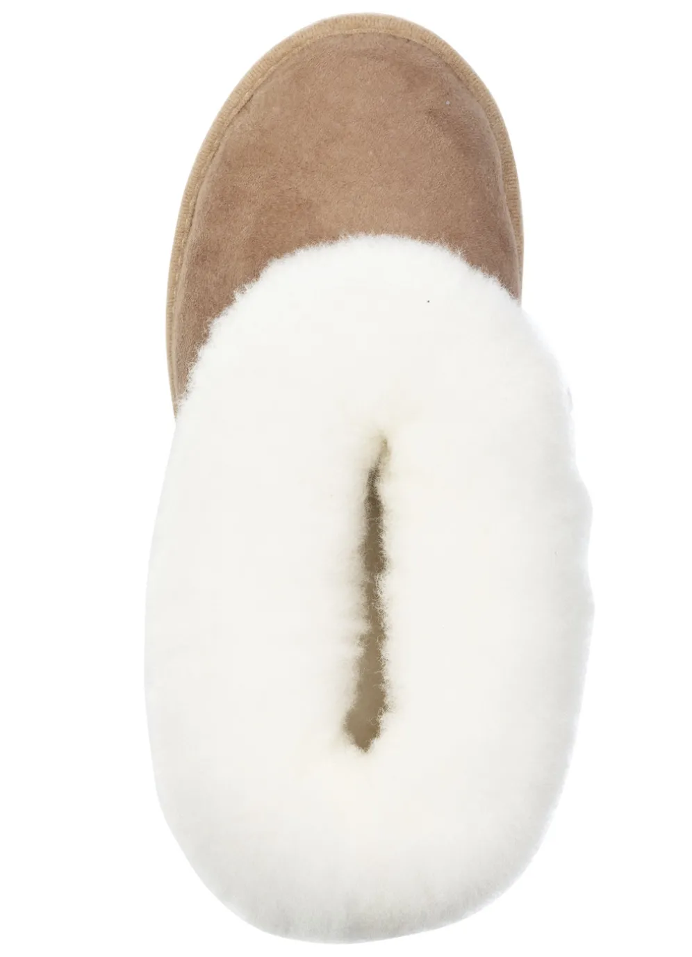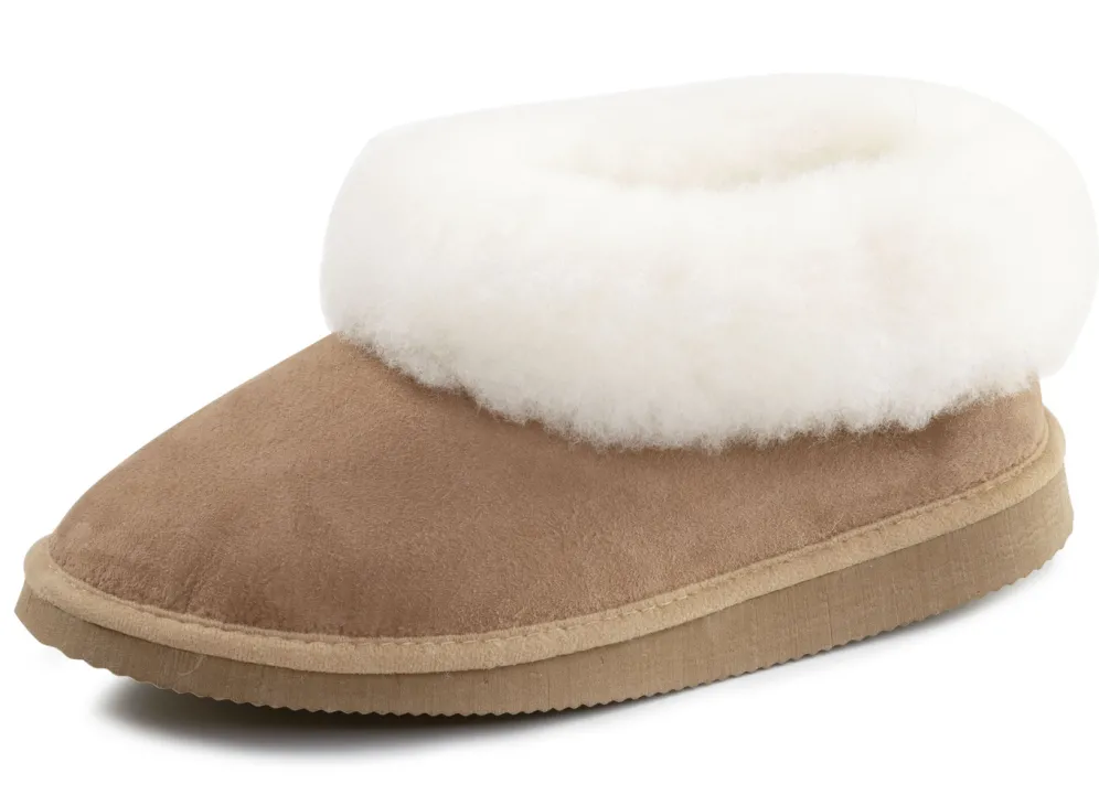 Hausschuhe von ELENA EDEN, aus weichem Leder in Tabakbraun, mit Kragen, Futter und Decksohle aus naturweißem Lammfell: Weite G, superleichte, flache EVA-Riffelsohle